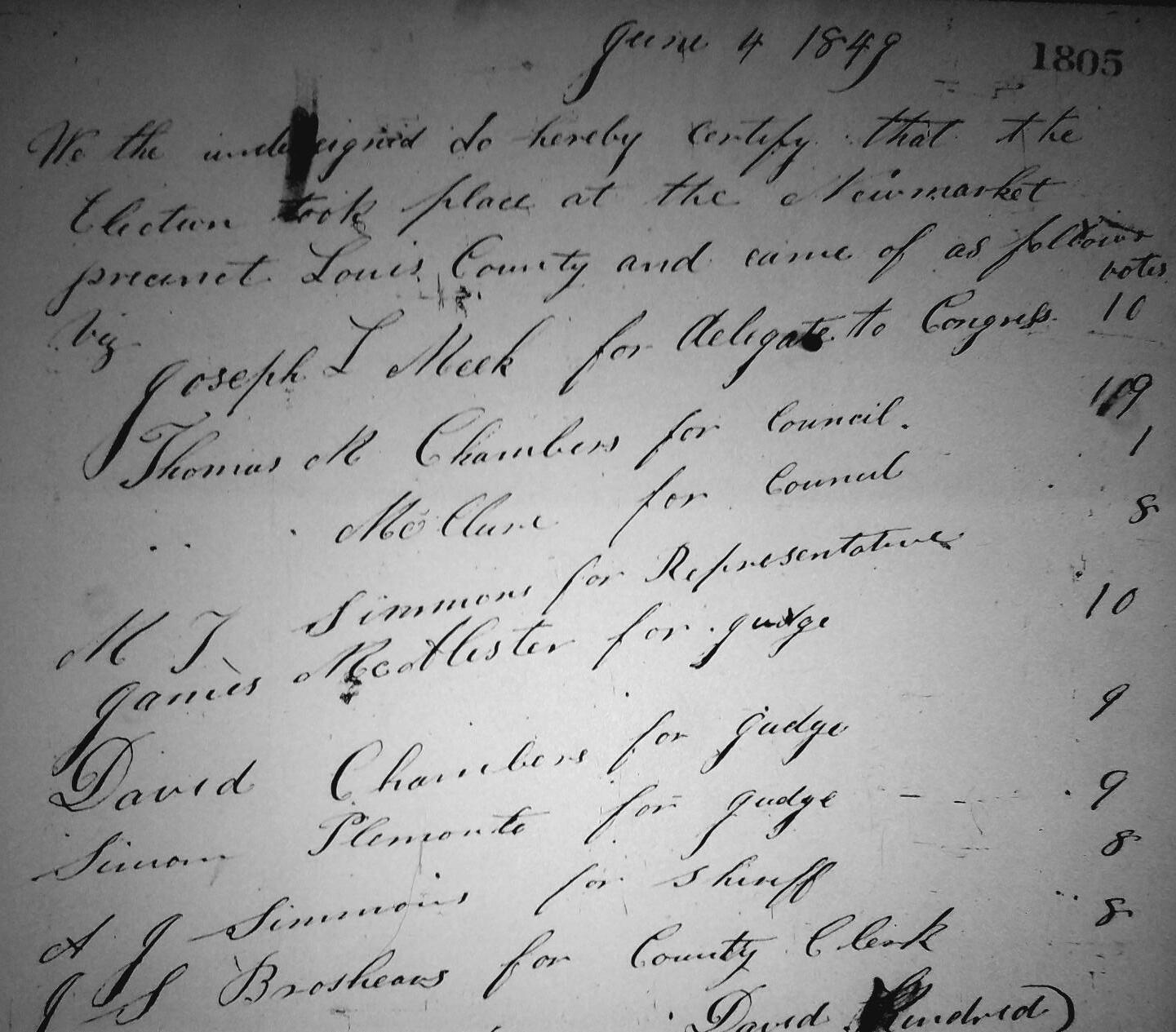 As an example, the index card for pioneer David Chambers lists three separate documents that contain his name. The numbers 1082, 1805, and 1854 refer to the actual documents. Switching to the pertinent microfilm reel of records, document #1805 is titled “1849 Election Returns, Lewis County, Newmarket Precinct.” During this election, David Chambers ran for the office of Lewis County judge, and received nine votes. The other documents include an 1849 Lewis County