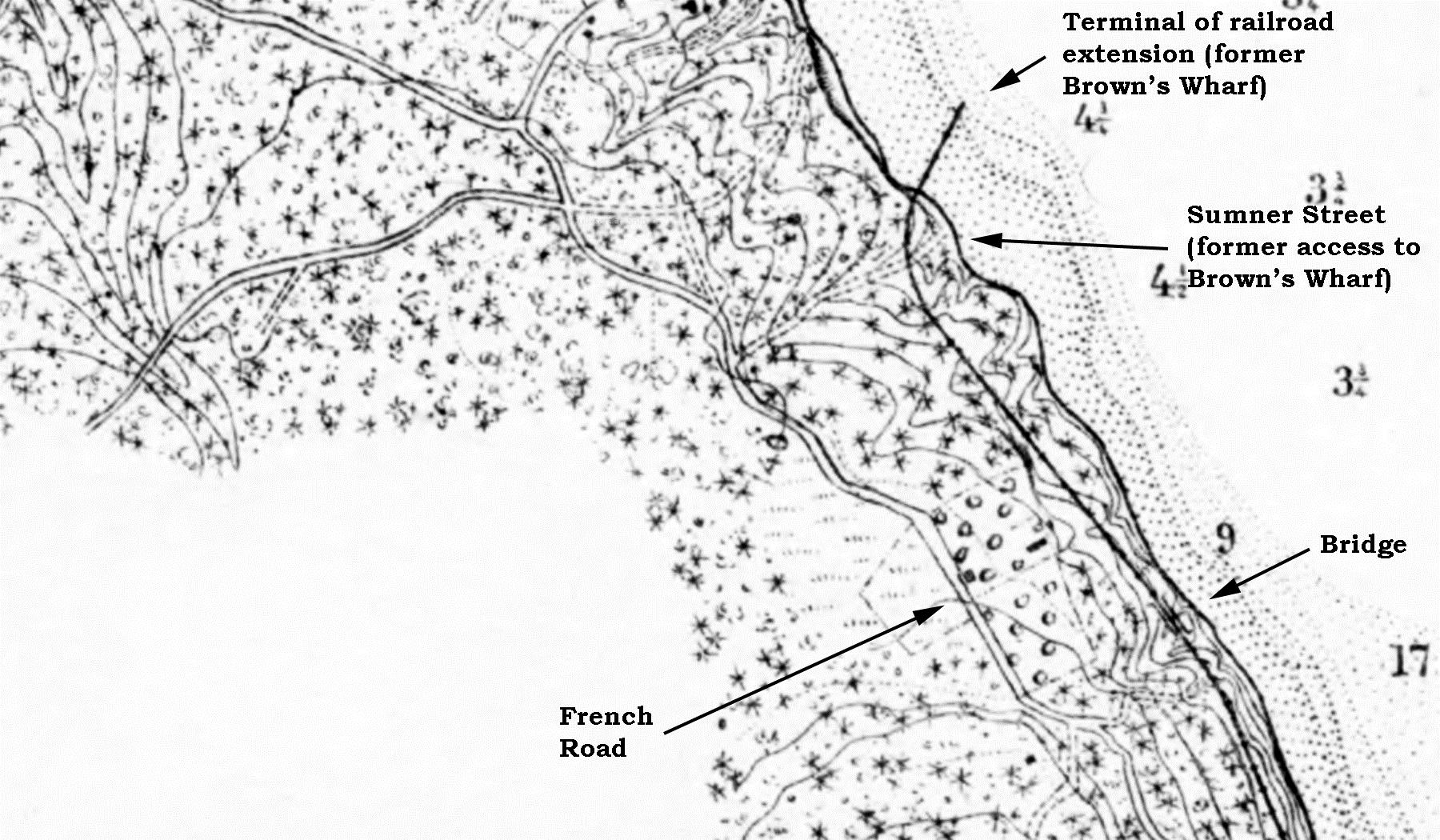 Immediately south of Old Port, the railroad grade is visible as a significantly high fill, immediately south of Anchor Lane. From that point, Anchor Lane rises so steeply that it could not have been used (as it appears today) to gain access to Brown’s Wharf.