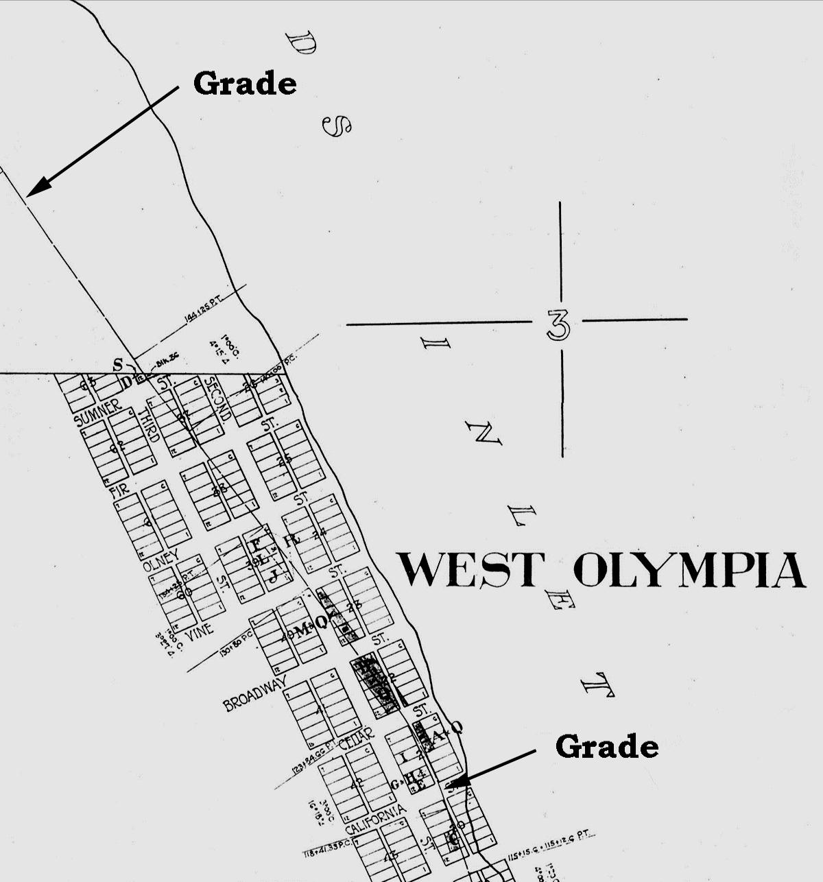 2. Evidently, the route immediately north of Brown’s Wharf was not yet settled, even though some grading in that region may have been done the previous year (as reported above in the October 31, 1890 Railway Gazette). Brown’s Wharf had been Olympia’s only deep-water moorage