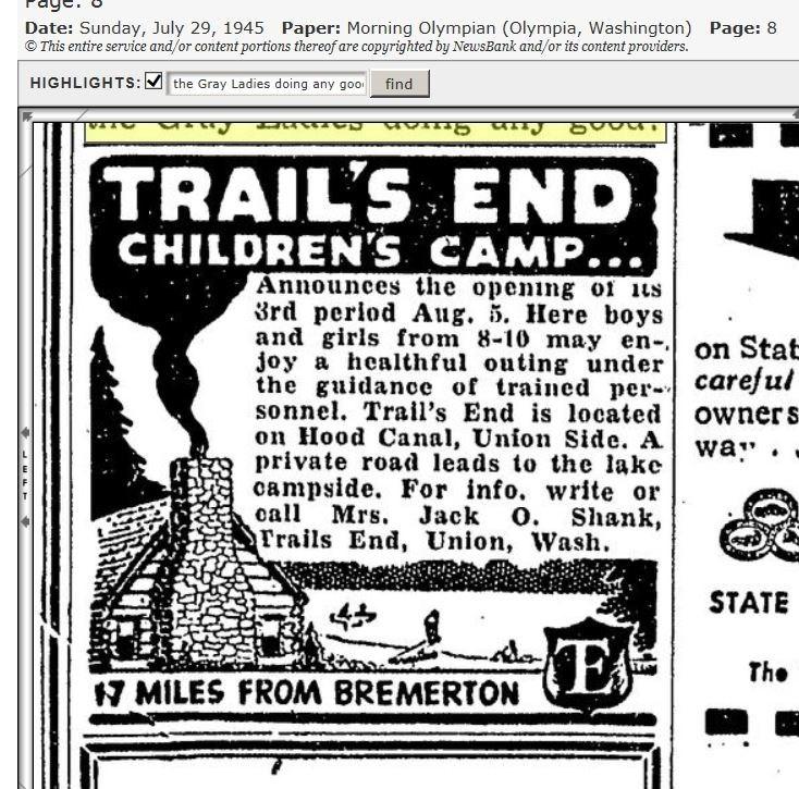 A typical ad for Trail’s End Ranch in Mason County. From the July 29, 1945 issue of the Daily Olympian.