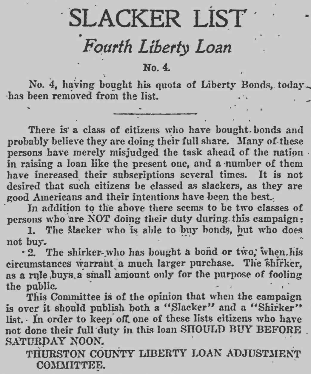 Although all bond drives were oversubscribed in Thurston County, people who for any reason refused to buy bonds (“slackers”) or buy bonds in the amount others thought they should (“shirkers”) were harassed. In October 1918, the Olympia Daily Recorder and Morning Olympian newspapers published a series of “Slacker Lists,” naming and shaming these people. The above ad was printed in the October 18, 1918 issue of the Olympia Daily Recorder.