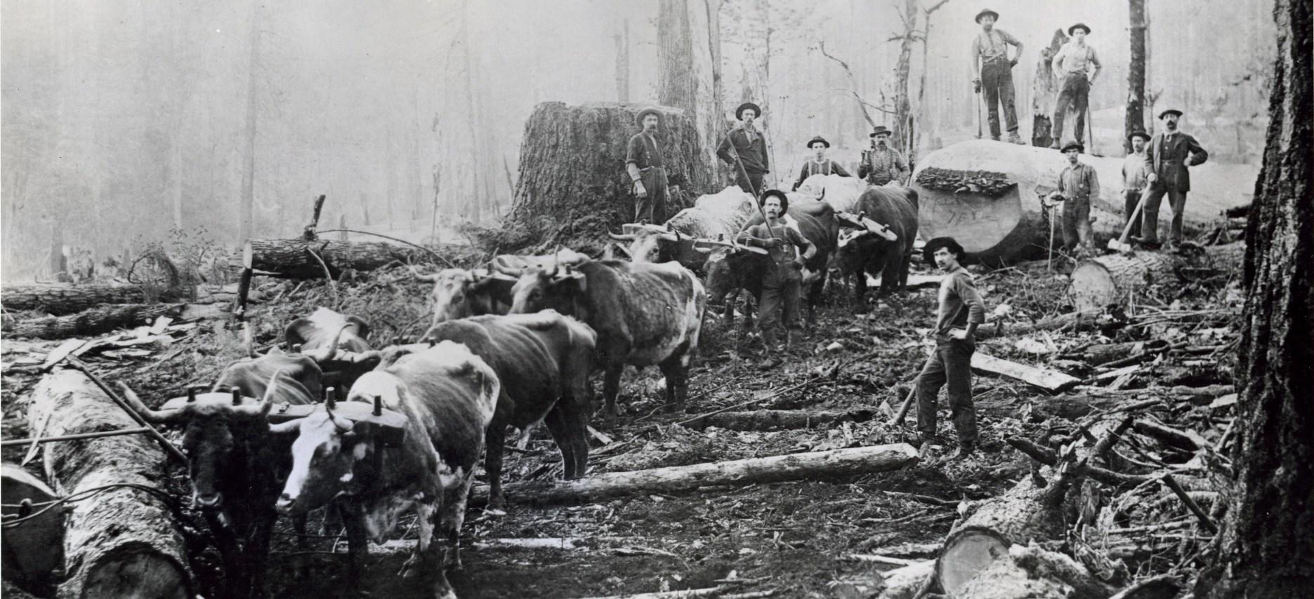 Circa 1903, artist Edward Lange drew this rather idyllic view of a logging scene in Thurston County; the vignette was part of a much larger work extolling the virtues of the city of Olympia. Image AR-28001001-ph002832, “Olympia, the capital of the State of Washington,” General Subjects Photograph Collection, 1845-2005. Image courtesy of Washington State Archives, Digital Archives.
