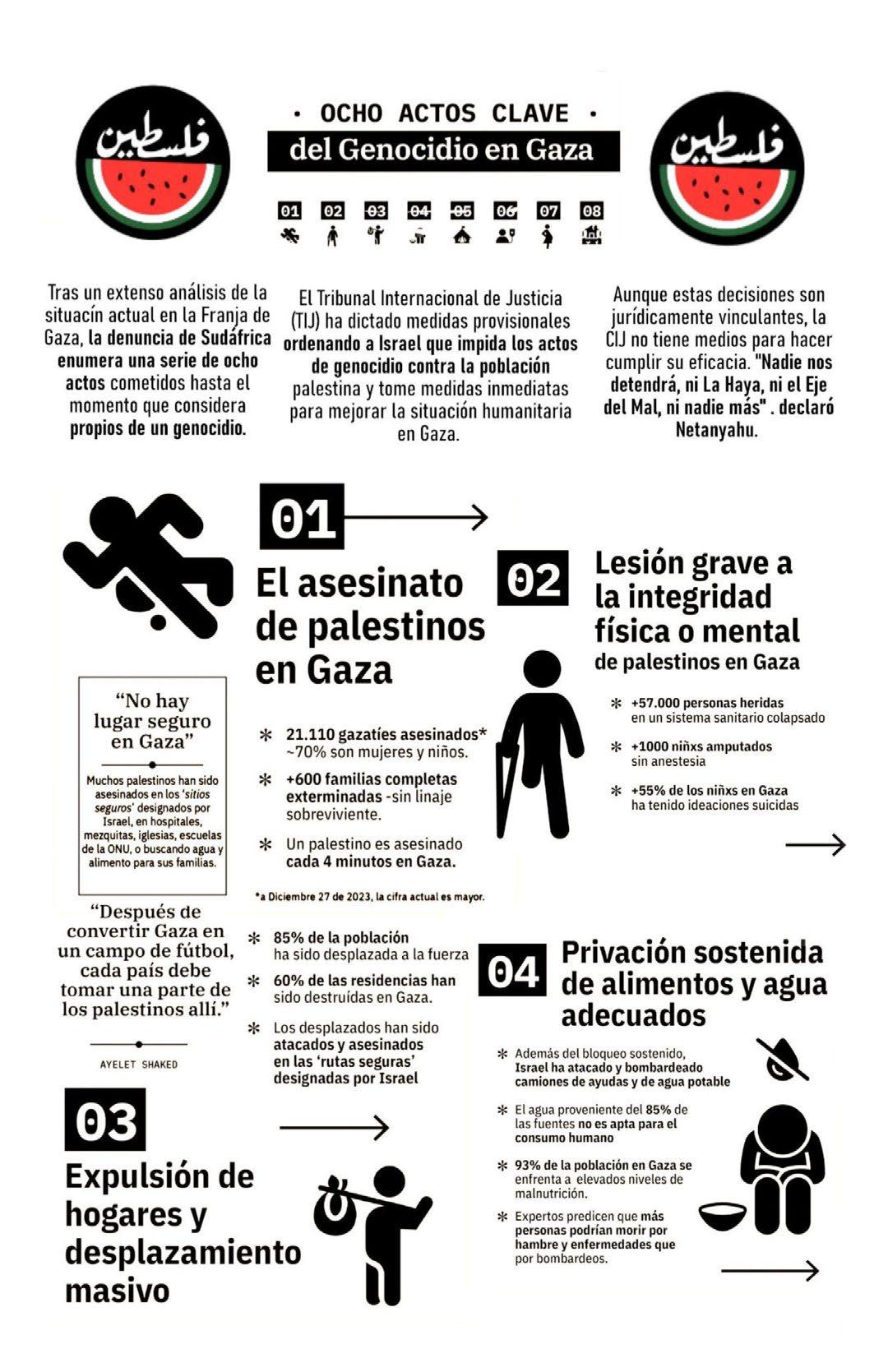 oficiales de la Embajada Palestina en Argentina (que a su vez toma como fuente a la información del Ministerio de Salud de Palestina), para la semana del 8-14 de julio de 2024 y en un balance no definitivo, la agresión de la ocupación israelí ha dejado un saldo de más de 38.919 palestinxs asesinadxs y al menos 93.795 heridxs. Pero si estas figuras ya son una tragedia en sí mismas, hace unos días la revista médica The Lancet 1 publicó un documento en el que este escenario sería incluso todavía más dramático: el número de muertos en Gaza podría superar los 186.000 en sólo 270 días, gran parte de ellxs niñxs, mujeres y ancianxs. Leyeron bien: 186.000 PERSONAS ASESINADAS EN 9 MESES. Esto es el 8% de toda la población palestina en Gaza. Cada instante hay más personas asesinadas de forma directa por las armas de muerte2; lxs otrxs, por falta de oxígeno, medicinas o insumos médicos (quedan en pie ya muy pocos hospitales y centros de atención médica en toda Gaza), alimento, agua, electricidad, gasolina, higiene. Se bombardean escuelas, hospitales y centros médicos, iglesias, mezquitas y otros sitios sagrados, campos y centros de refugiados, edificios de Naciones Unidas3 y otros organismos de ayuda humanitaria, medios de comunicación, edificios gubernamentales. Desde luego hogares. En definitiva, nada ni nadie está a salvo en Gaza (Israel viene cometiendo incontables masacres incluso en las áreas determinadas por ellxs mismxs como “zonas seguras” para la población gazatí) y la destrucción no tiene antecedentes. Es una “barbarie” contra la humanidad que a diferencia de otras que hubo