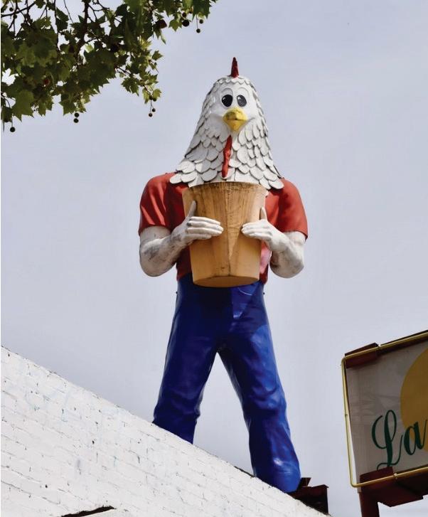 erched high above Figueroa Street in Highland Park stands Chicken Boy — a neighborhood icon and in many ways a fitting symbol for all things strange and wonderful about Los Angeles. Standing atop a squat Streamline Moderne commercial building, this feathered, fiberglass icon stands 22 feet tall with the head of a chicken and the brawny body of a man in blue jeans and a red shirt holding, of all things, a large bucket of chicken. With a proud, yet slightly startled look on his face — perhaps owing to the fact that he’s hawking a bucket of his fellow fowl — Chicken Boy has come to be known as the “Statue of Liberty of Los Angeles.” But it was a long, hard-fought journey to gain such revered status.