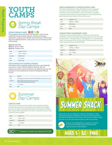 YOUTH CAMPS Spring Break Day Camps SPRING BREAK CAMPS This program offers activities that promote: active living, exploring natural outdoor spaces, creative and artistic expression, making new friends and having lots of FUN. Each day has a different theme. Sign up for one or two days or the whole week! April 15: Ball Blast April 17: Arts & Crafts April 18: Outdoor Fun Days: