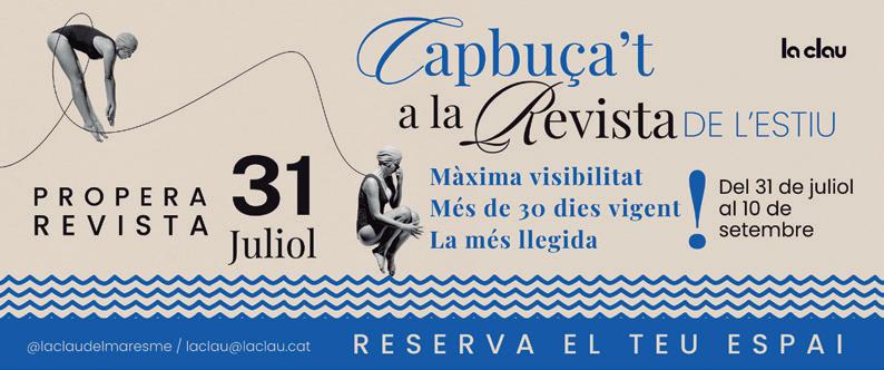 La revista LA CLAU no es fa responsable del contingut dels articles i missatges publicitaris dels anunciants. No és permesa la reproducció total o parcial d’aquesta publicació, ni el seu tractament informàtic, ni la transmissió de cap forma o per qualsevol mitjà, ja sigui electrònic, mecànic, per fotocòpia, per registre o d’altres mitjans, sense el permís previ i escrit dels titulars dels drets de la propietat intel·lectual. Dep. Legal B. 12. 188/84