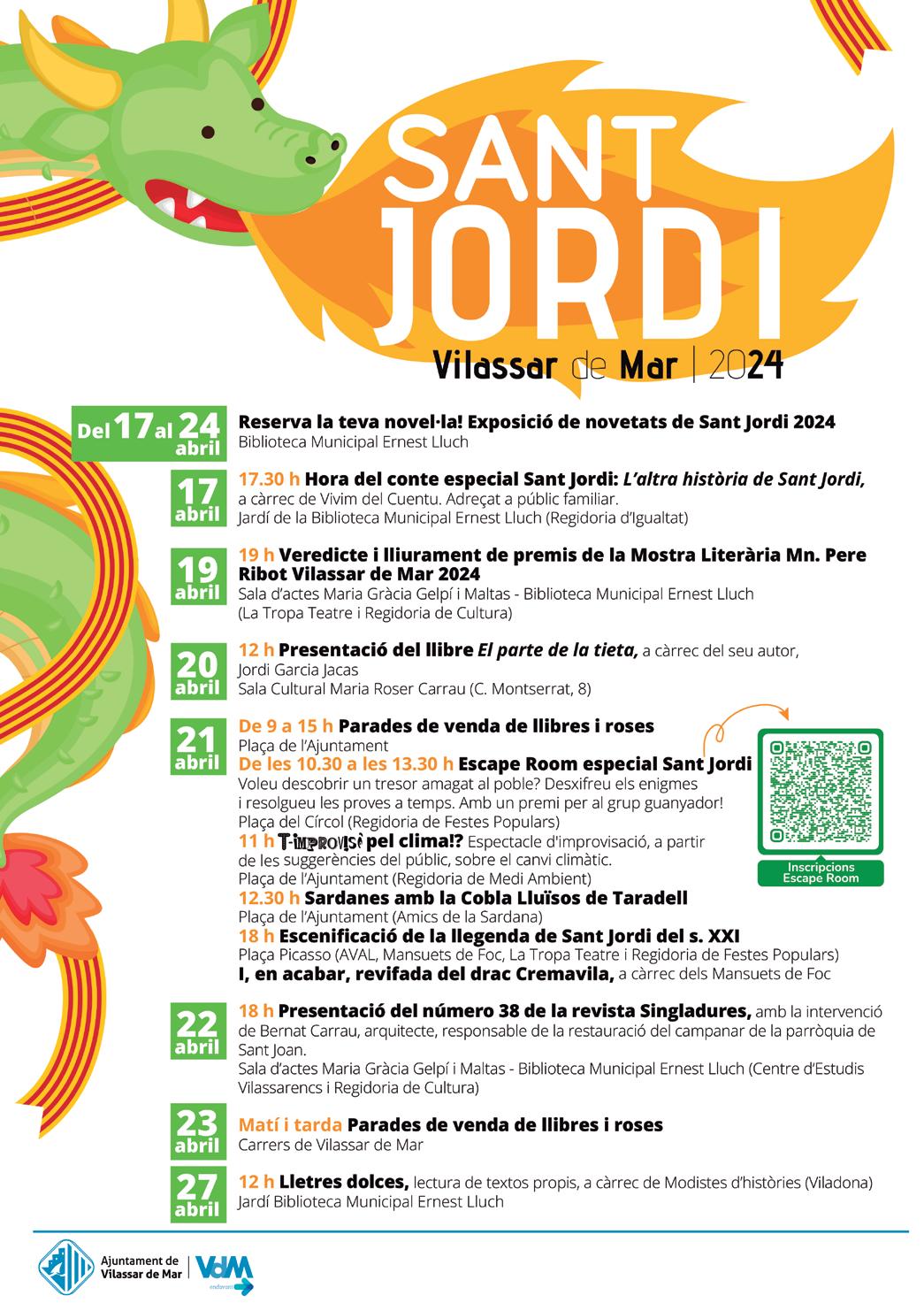 Dt. 23/4/24 | 10 h | Pl. de l’Església. La Biblioteca surt al carrer. 10 h, Sala Polivalent ‘1 d’octubre’ del CC Calisay: visita el drac Arenyot a la seva cova, acompanyat pels gegants d’Arenys de Mar. A les 17.30 h: despertarem el drac. 18 h: cecavila del drac Arenyot per la Riera del pati del Calisay fins al Mercat Municipal. 18.30 h a la porxada del mercat municipal: La llegenda de Sant Jordi i el Drac. 19:30 h, a la riera davant el mercat mpal: ballada de sardanes per Sant Jordi.