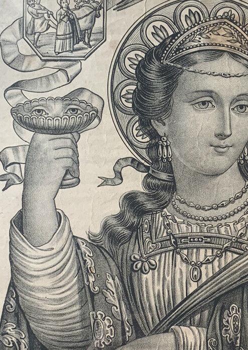 dimostra la presenza di una prima immagine della santa siracusana nella chiesa di San Giovanni Evangelista a San Cesario di Lecce, fino a quando venne poi soppiantato dall’attuale schema iconografico. Se andiamo ad analizzare gli attributi iconografici della Santa possiamo notare che è forse una delle poche sante martiri che presenta raramente gli strumenti del suo martirio (Spada o pugnale, buoi, fiamme) ma al loro posto il piatto con gli occhi simbolo che prefigura il suo nome “Lucia da Luce” e che si carica di una simbologia cristiana non indifferente.