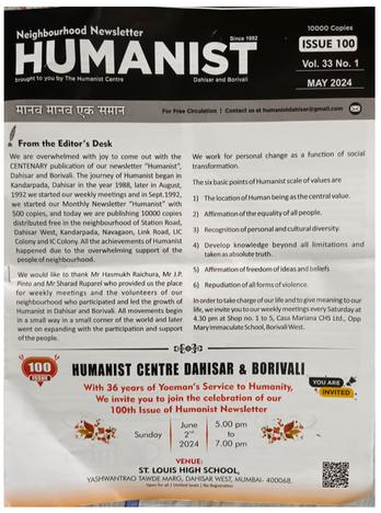 Se publicó el número 100 del boletín "HUMANISTA", se distribuyeron 10 000 ejemplares en los barrios de Dahisar y Borivali, el coste se cubre mediante publicidad El 2 de junio se organizó un evento en St Louis High School al que asistieron 74 personas del barrio