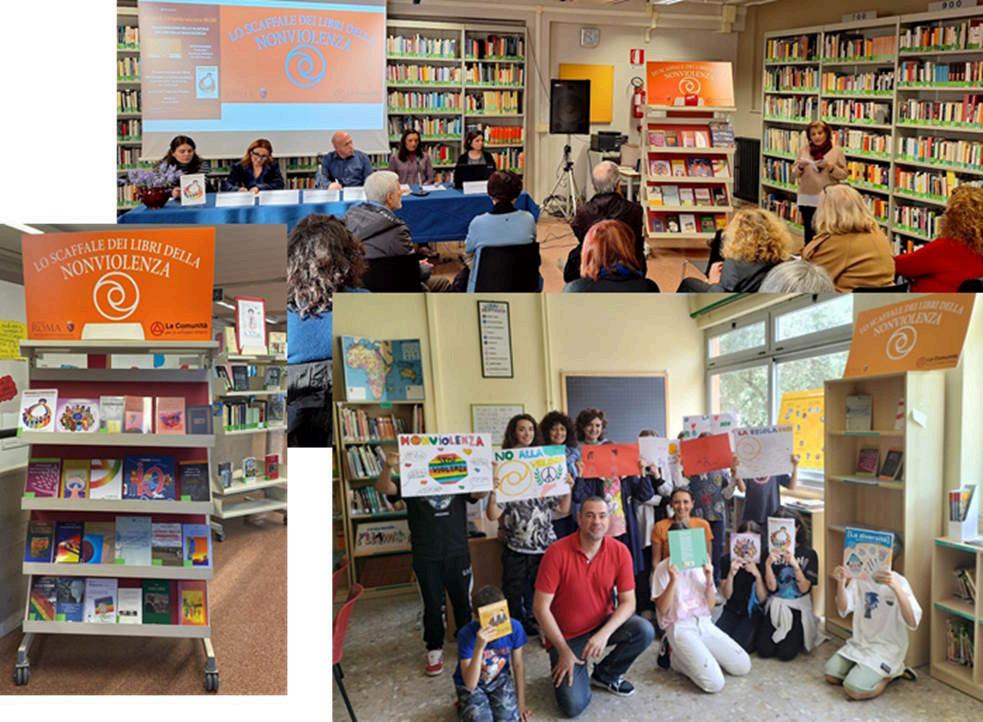 En el barrio romano de Tor bella Monaca continúa la marcha de "La estantería de los libros de la no violencia". El 17 de mayo de 2024 inauguramos otra en la biblioteca del barrio "Cubo Libro". Una biblioteca que es también un centro cultural y social lleno de actividades pedagógicas y lúdicas para niños y niñas que viven en uno de los barrios desfavorecidos de Roma. En este caso, la estantería se convierte en un símbolo y una defensa contra todo tipo de violencia en la vida cotidiana. Ahora, con la presencia del estante hemos creado la posibilidad de otras opciones y salidas. Mientras tanto, en las estanterías ya instaladas en las escuelas se desarrollan actividades con el tema de la no violencia, como la lectura de la autobiografía de Nelson Mandela y la proyección de la película "Invictus".