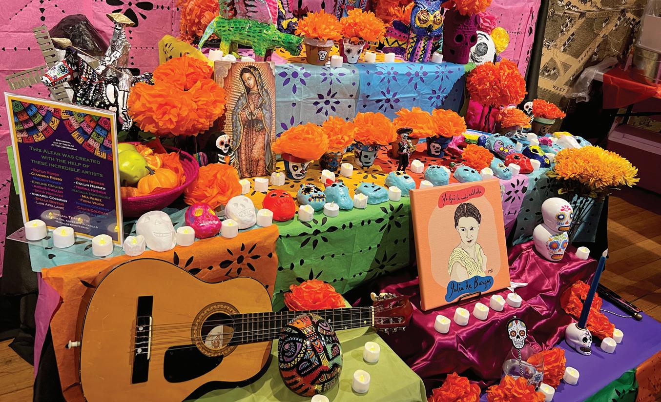 Flores de colores, papel picado, dulces mexi canos, cruces de color blanco y veladoras for maron parte del altar.
