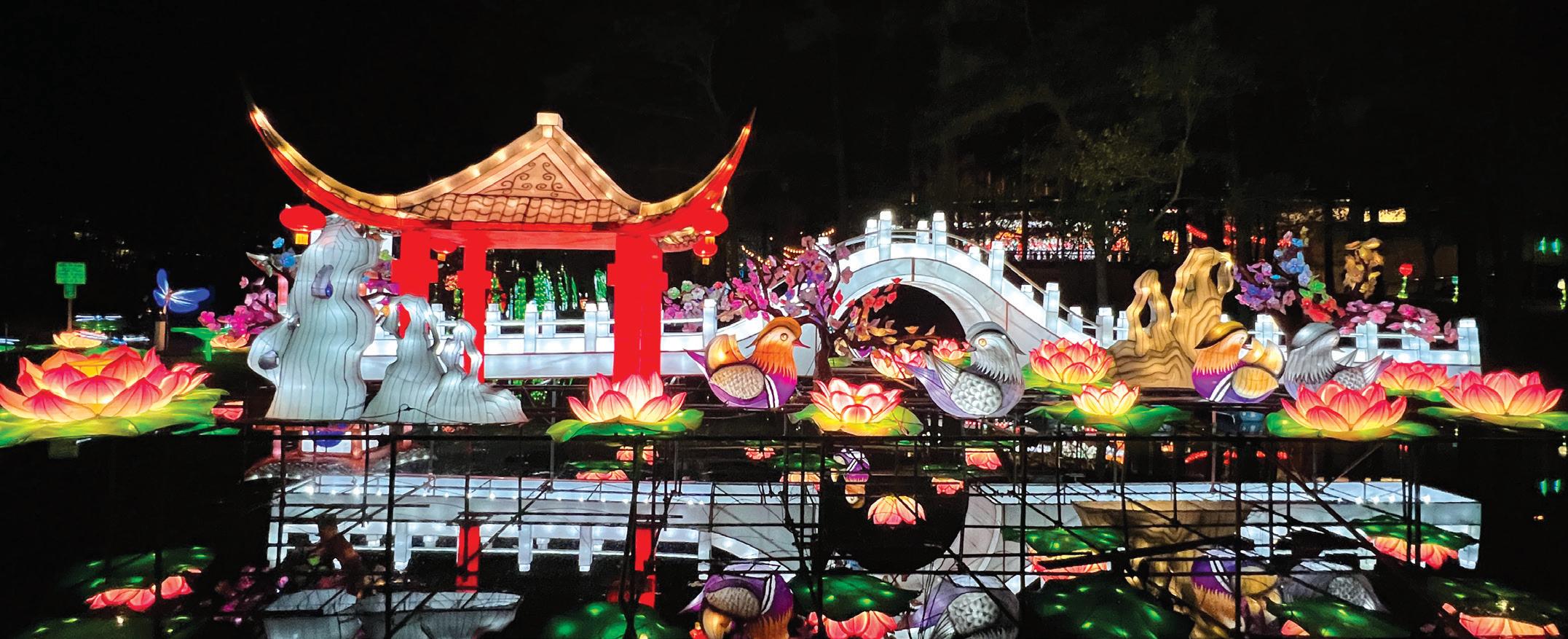 Cary, N.C., 21 de noviembre de 2022- “He chizante” es la palabra con la cual muchos espectadores del Festival de Linternas Chinas de Carolina del Norte describieron el des pliegue de tecnología, pantallas y colores que tiñe de alegría los espacios al aire libre, lagunas, cami nerías y terrazas del Koka Booth Amphitheatre de Cary.