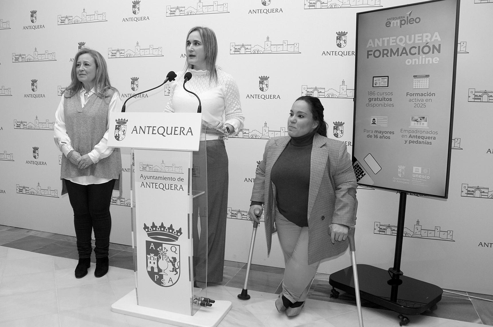 La concejal delegada de Promoción para el Empleo, Paqui Sánchez, junto a la concejal de A n e j o s , S a r a R í o s , y l a p r e s idente de la ELA de Bobadilla E s t a c i ó n , D i a n a R a m o s , h a n presentado en rueda de prensa e s t a a c c i ó n o n l i n e q u e e s t a r á disponible durante todo el año 2025