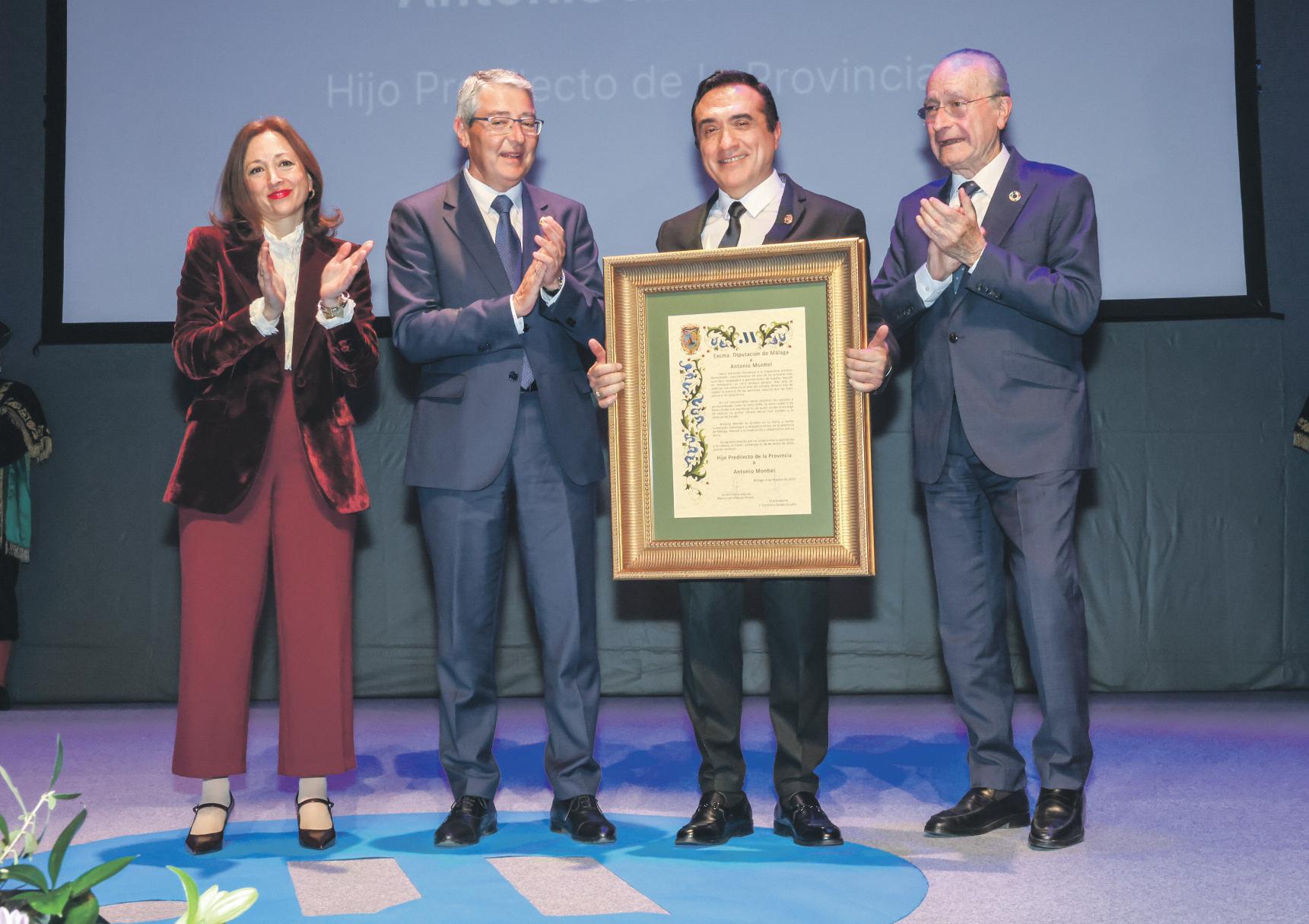 El pintor antequerano, Antonio Montiel, ya ha recibido el título de Hijo Predilecto de la Provincia de Málaga Se fue de Málaga para triunfar en Málaga, y lo ha conseguido La entrega se ha hecho efectiva esta semana en un acto en el que el presidente del ente supramunicipal, Francisco Salado, ha destacado la extensa carrera del artista que, además de dominar con maestría el arte del retrato, tiene el don de captar la esencia de las personas De hecho, l e l l a m a n ‘ E l P i n t o r d e l Alma’ En su obra destacan los retratos a personalidades como la Reina Sofía, la Reina Isabel II de Inglaterra, el Rey Felipe VI, Fidel Castro, Rocío Jurado o Lola Flores /Págs 2, 16 y 17