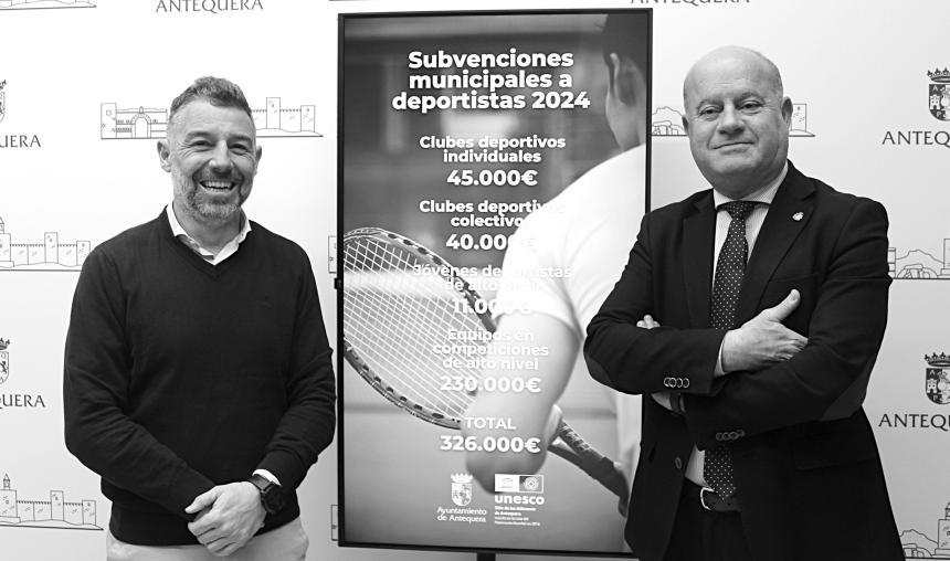 A N T E Q U E R A . E l Ay u n t amiento de Antequera destina más de 300 000 euros a subvenciones para deportistas y clubes en este año 2025 Son, en concreto, 326 000 euros los que el consistorio va a dedicar a este f i n , s e g ú n h a c o n f i r m a d o e l a l c a l d e , M a n o l o B a r ó n , y e l teniente de alcalde de Deportes, Juan Rosas