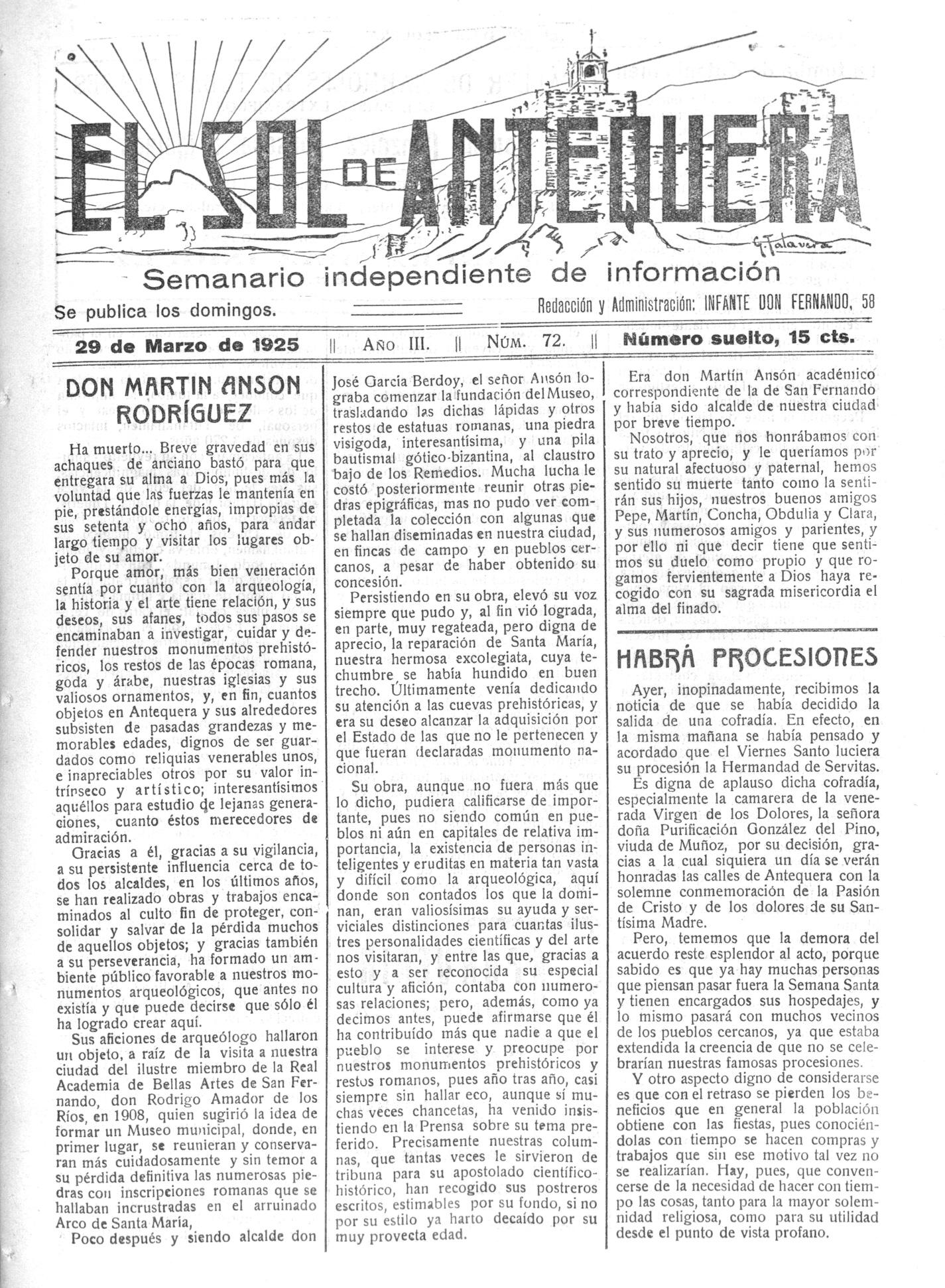 i e r o n siendo ámbito y escaparate público desde el que se clamaba por la conservación del patrimonio antequerano al tiempo que se denunciaba la generalizada y negligente indiferencia tanto de las autoridades locales como del conjunto de la ciudadanía Ya en enero, el futuro director del semanario, José Muñoz Burgos, dirige carta abierta al alcalde de la ciudad pidiéndole que pusiese r e m e d i o a l e s t a d o s e m i r r u i n o s o en el que se encontraba la torre del Pa p a b e l l o t a s , r e l i q u i a h i s t ó r i c a y emblema de la ciudad digno de ser c o n s e r v a d o E n m a r z o , M a r t í n Ansón, escasos días antes de fallec e r y a