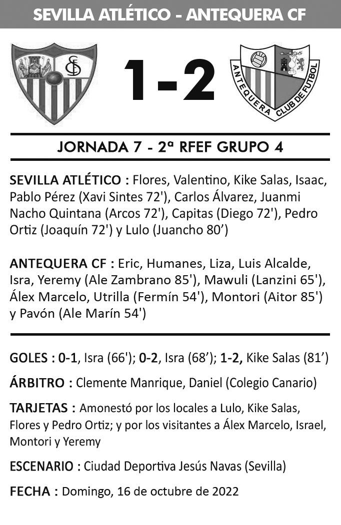 Efecto de los cambios, una contra fulgurante tras un saque de esquina del Sevilla Atlético se iba a transfor mar en el primer tanto para el Ante quera Ale Marín recogía el rechace tras e l d e s p e j e d e l a z a g a a n t e q u e r a n a y s e s e r e c o r r í a m e d i o c a m p o , e n u n fallo defensivo de los sevillistas, para atraer al último de los defensores y al p o r t e r o a l o s q u e e n g a ñ ó s i r v i e n d o en bandeja a Isra, que acompañaba la jugada por la derecha, para que mar case a placer el 0 1