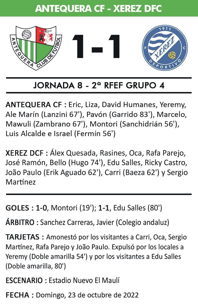 Sigue sumando el equipo blanquiverde con un empate en El Maulí el pasado domingo frente al Xerez Deportivo CF y permanece invicto una jornada más Fue un partido complicado para el Antequera al quedarse el equipo con diez futbolistas en el minuto 54’ de juego por la segunda amarilla a Yeremy, lo que obligó a jugar en inferioridad el resto de la segunda parte