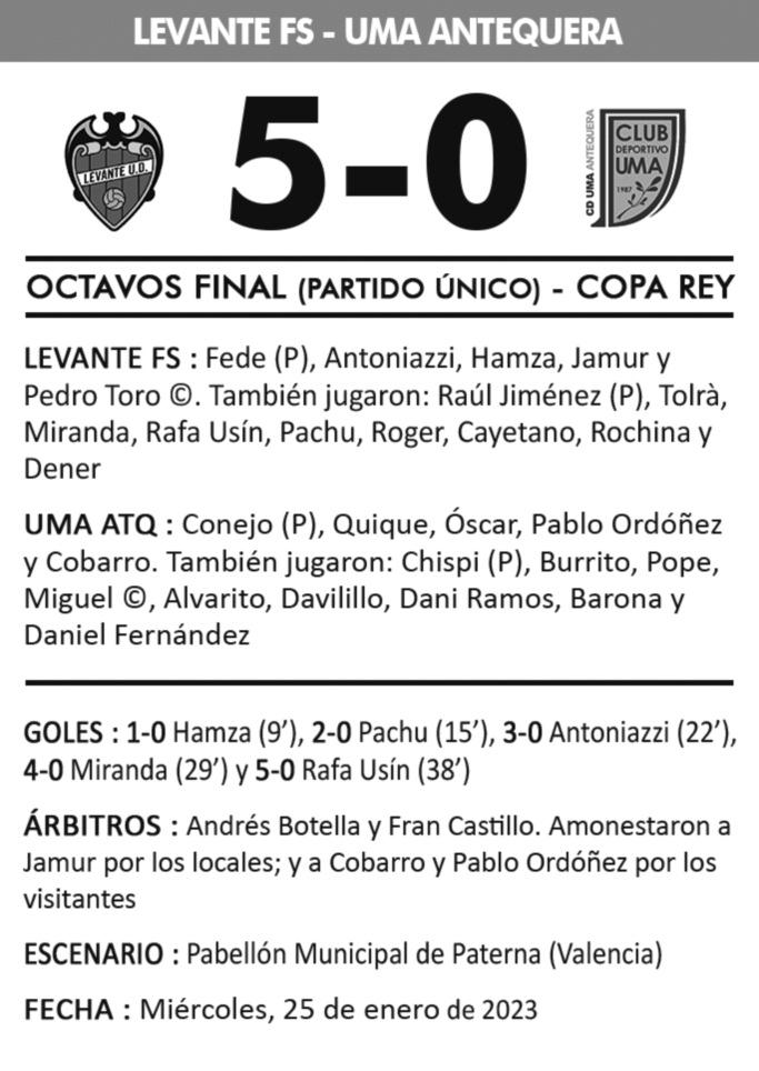 La defensa del título de campeón de la C o p a d e l R e y f i n a l i z ó e n e l Pa b e l l ó n Municipal de Paterna este pasado miércoles para el BeSoccer UMA Antequera, que encajó una durísima derrota ante el Levante UD FS (5-0) y dijo adiós a un torneo en el que había competido muy bien durante las últimas temporadas, en especial, en la del año pasado con e s e b r o c h e i n o l v i d a b l e e n e l O l i v o Arena de Jaén N o f u e e l r e s u l t a d o d e s e a d o n i mucho menos, pero en el deporte de élite hay que saber convivir con dinámicas positivas y con otras que no lo son tanto En este arranque del 2023 al equipo de Tete le está costando arrancar y no están acompañando los result a d o s L o s c i n c o g o l e s e n c o n t r a n o d e b e n t r a n s f o r m a r s e e n u n a p e s a d a carga y ahora toca dejar atrás lo ocurrido, colocarse el mono de trabajo y encarar los próximos compromisos con el ánimo de recuperar una identidad c o m p e t i t i va q u e s e a s u f i c i e n t e p a r a poder obtener la recompensa de la victoria