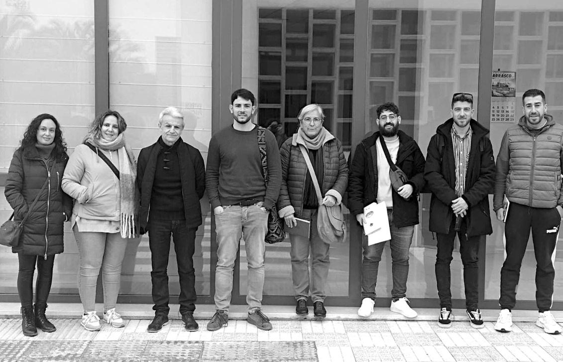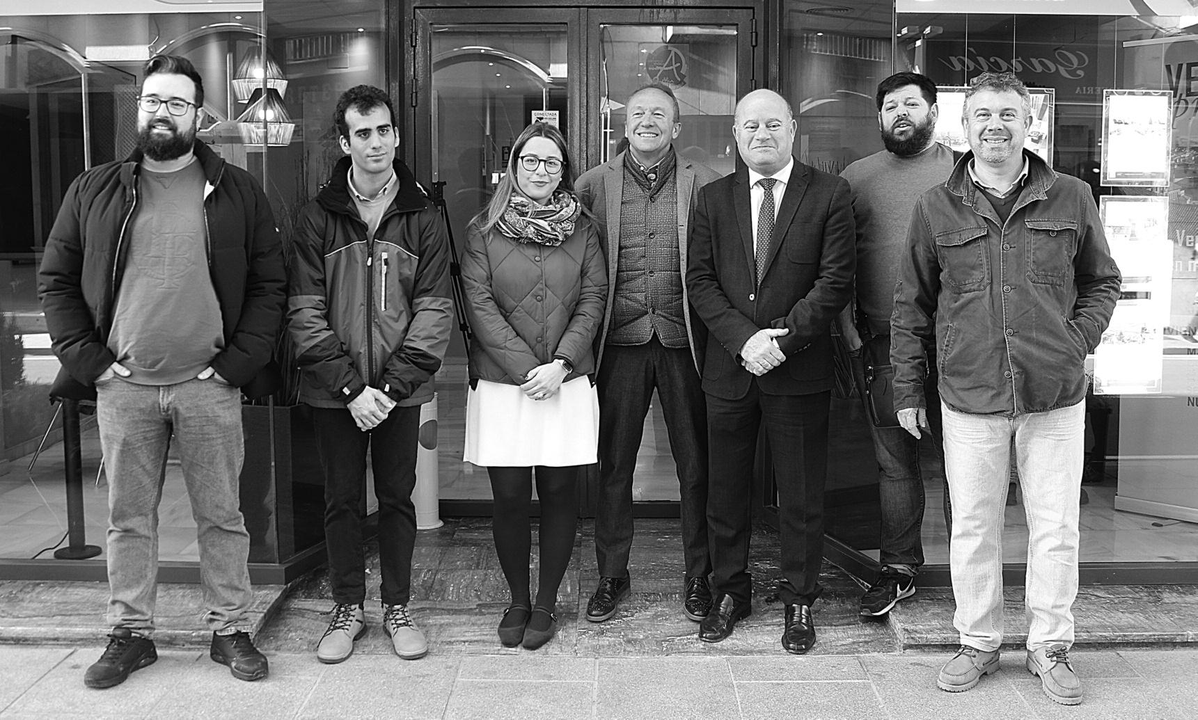 n Román Mejías (en el centro) posa a las puertas de su inmobiliaria en Calle Infante D. Fernando junto a autoridades y miembros representantes de las agrupaciones carnavalescas antequeranas