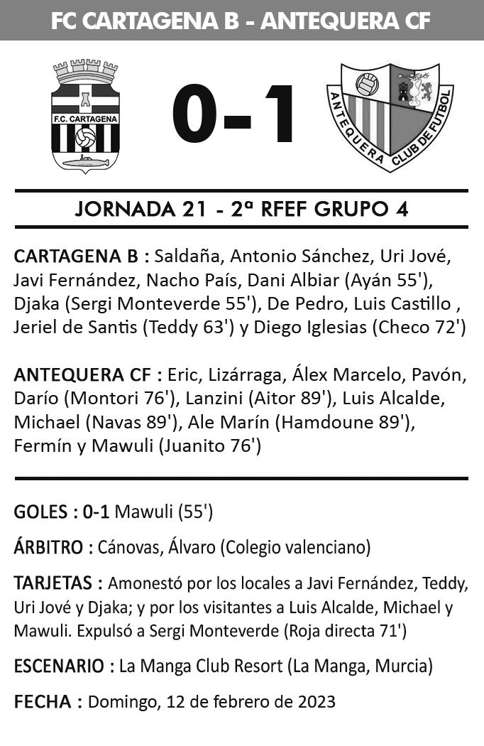 L a e s t r a t e g i a d e l A n t e q u e r a e n l a segunda mitad fue no apretar tanto de inicio, esperando al rival en campo propio para lanzarse a matar el partido a la contra Cayó de lleno el filial del Cartagena y en el 48’, Mawuli avisaba de lo que se les venía encima con un golpeo seco desde la medialuna del área que, por desgracia, se estrellaba en la madera