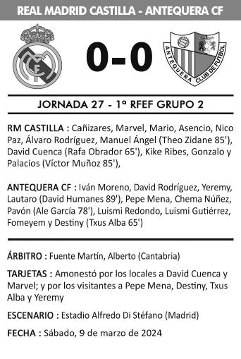 En el segundo tiempo el Castilla se fue al ataque e Iván Moreno las sacó d e t o d o s l o s c o l o r e s , i n c l u i d o u n p e n a l t i e n e l 5 7 ’ p o r z a n c a d i l l a c l a r a d e Pe p e M e n a a Pa l a c i o s E l p o r t e r o h i z o u n p a r a d ó n a m a n o c a m b i a d a p a r a e v i t a r q u e e l l a n z a m i e n t o a m e d i a a l t u r a d e N i c o Pa z l e c o n v i rtiese de nuevo, como en el partido de la primera vuelta, en el verdugo de los antequeranos