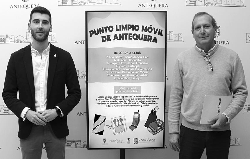 A N T E Q U E R A . E l Ay u n t amiento retoma, tras unos años d e p a r ó n , e l P u n t o L i m p i o Móvil junto con la asociación Madre Coraje a fin de facilitar el reciclaje y avanzar en la sostenibilidad medioambiental Lo h a a n u n c i a d o e l c o n c e j a l d e Medio Ambiente, José Manuel Fernández, junto con el gerente del ente, Avelino Mañas