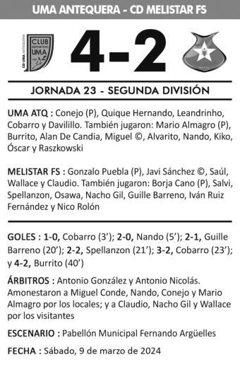 Su último verdugo en la competic i ó n l i g u e r a l e v o l v i ó a p l a n t e a r u n encuentro muy incómodo y le equilib r ó u n 2 - 0 q u e e s t a b l e c i ó C o b a r r o y Nando en los primeros minutos Guil l e B a r r e n o m a r c ó e l 2 - 1 a l f i n a l d e l primer tiempo y Spellanzon el 3-2 al comienzo del segundo Cobarro tuvo q u e a c e r t a r , d e c a r a a p u e r t a , p o r segunda vez para recuperar la ventaja (3-2) y Burrito sentenció el marcador en los últimos compases del duelo El triunfo frente a Melilla tiene un valor especial pues certifica la extraord i n a r i a t e m p o r a d a q u e e s t á n r e a l iz a n d o l o s p u p i l o s d e J o s é A n t o n i o Borrego “Tete”, ya que han sido capaces de firmar una vuelta completa del campeonato sin perder y, en el Argüelles, siguen invictos con un total de 11 victorias y un empate L a v i s i t a d e l C D M e l i s t a r F S a l a Ciudad de Los Dólmenes estaba marc a d a e n r o j o e n e l c a l e n d a r i o H a b í a g a n a s e n e l p l a n t e l ve r d e d e r e ve r t i r a q u e l l a d e r r o t a q u e s u f r i d a e l 1 1 d e n o v i e m b r e d e 2 0 2 3 e n e l P a b e l l ó n Javier Imbroda de Melilla (4-2). Si ya había una motivación en los j u g a d o r e s p o r g a n a r e s t a c o n t i e n d a , el público presente en las gradas del p a b e l l ó n a n t e q u e r a n o l e s p e g ó u n e m p u j ó n e x t r a c o n u n e x t r a o r d i n ario recibimiento y unas pancartas con el siguiente mensaje: “Siempre juntos Unidos hasta el final”