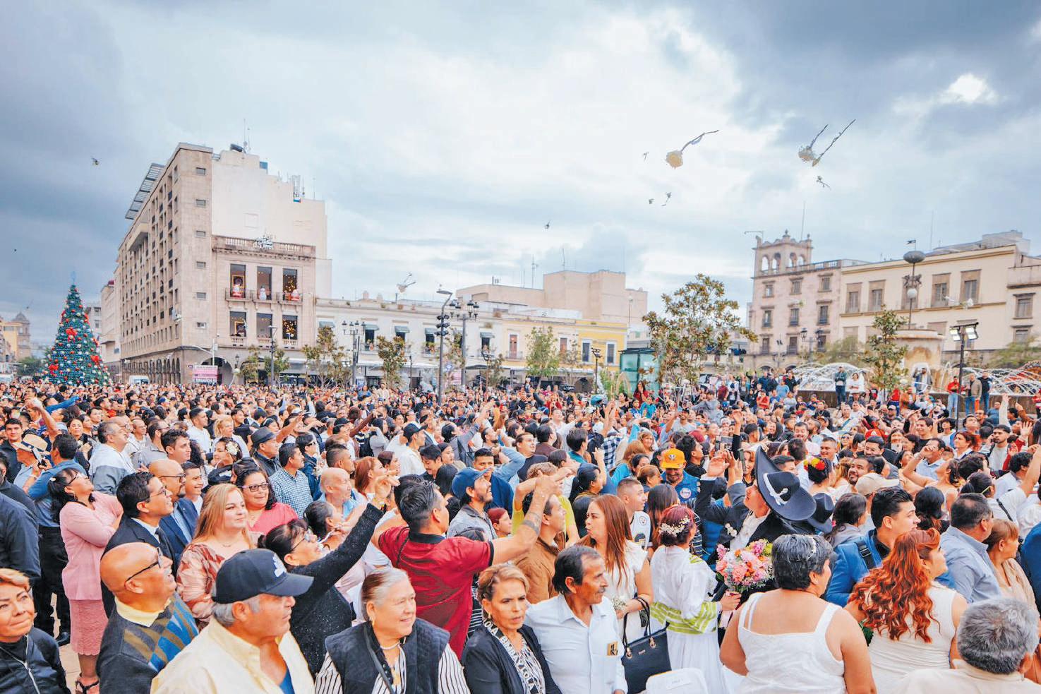 Con madrina de lujo en la persona de Vero Delgadillo, alcaldesa de Guadalajara, mil 726 parejas se unieron en matrimonio, con todas las de la ley, en el Centro Histórico de la ciudad. Entre vestidos blancos, trajes formales y de charro, más de tres mil personas acudieron el sábado a la ceremonia anual de matrimonios colectivos en la Plaza Guadalajara.