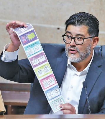 Arriba: la gobernadora Maru Campos; abajo, un acordeón chihuahuense y, a la derecha de estas líneas, el magistrado electoral Reyes Rodríguez mostrando otra versión de estos materiales que circularon en el país