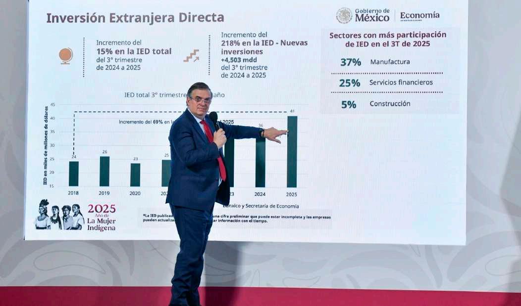 Buena noticia. La Secretaría de Economía informó que México rompió récord en Inversión Extranjera Directa al llegar a casi 41 mil millones de dólares al tercer trimestre de 2025, que en comparación con 2024, representa un incremento del 15 por ciento, lo que significa que se está invirtiendo en el país en una mayor proporción a lo que se esperaba. NACIONAL / PAG. 6