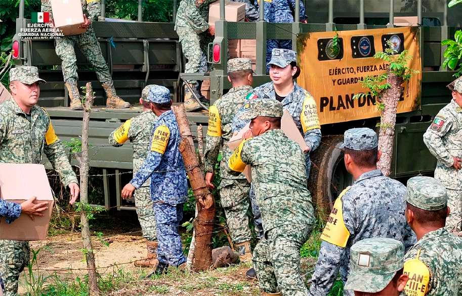 130 elementos castrenses, entre Ejército, Fuerza Aérea y Guardia Nacional, realizan acciones de perifoneo y monitoreo de los ríos Chiquito, Coatzacoalcos y Jaltepec, al tiempo que han entregado 3 mil 300 despensas en 14 comunidades afectadas por la Onda Tropical No. 34, esto como parte del Plan DN-III-E en su fase de auxilio a la población.