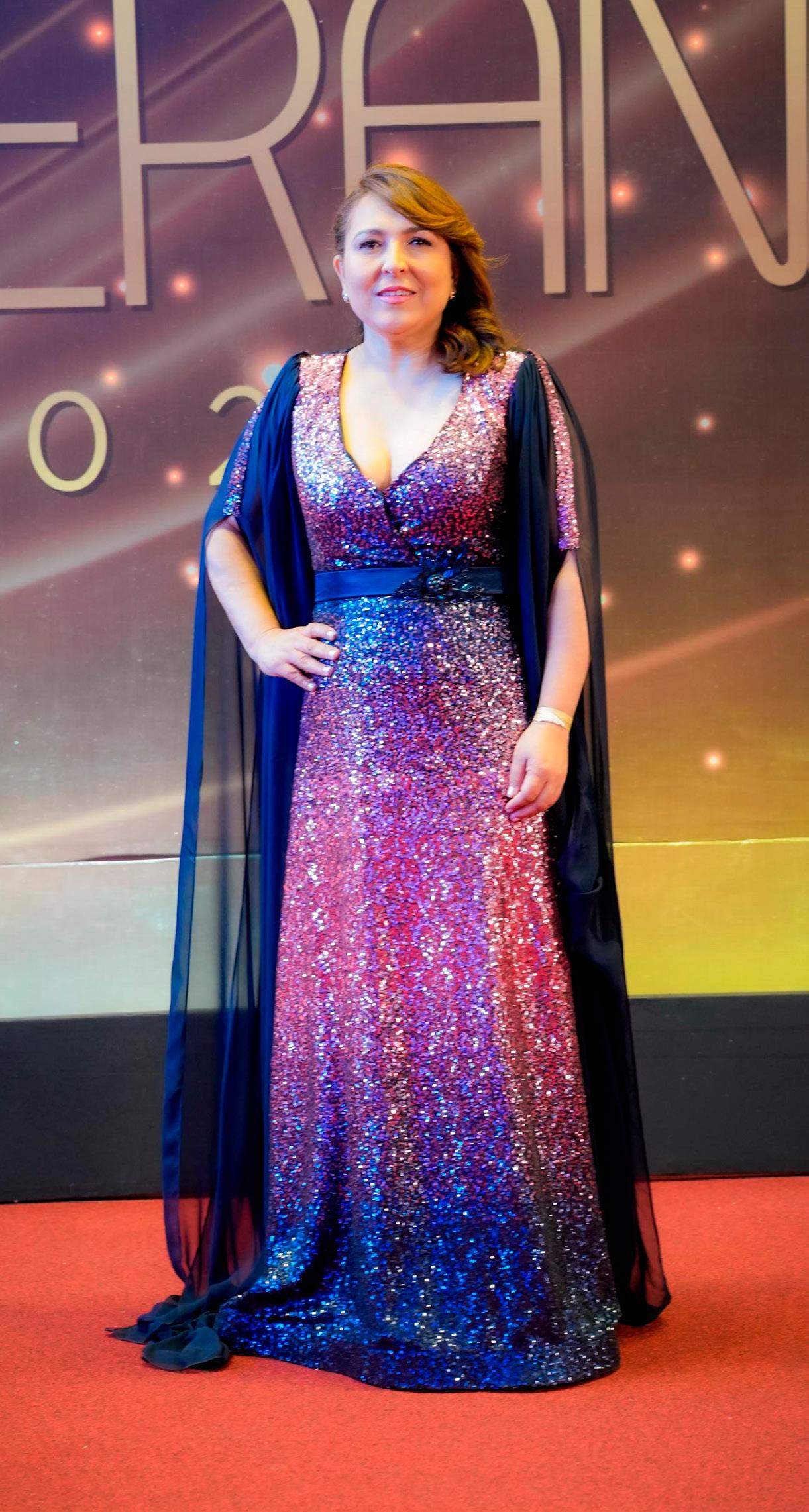 El tono seleccionado fue el azul marino profundo, casi añil, mezclado con la base central de lentejuelas azul noche, con degradación rosa metálico casi fucsia. Texturas que combinamos a la perfección. La personalidad de Emelyn Baldera es discreta, sobria, sencilla y clásica, pero le gusta lucir elegante con lo que lleva puesto y cómoda a la vez, algo complicado pero posible de lograr con la experiencia en el oficio.
