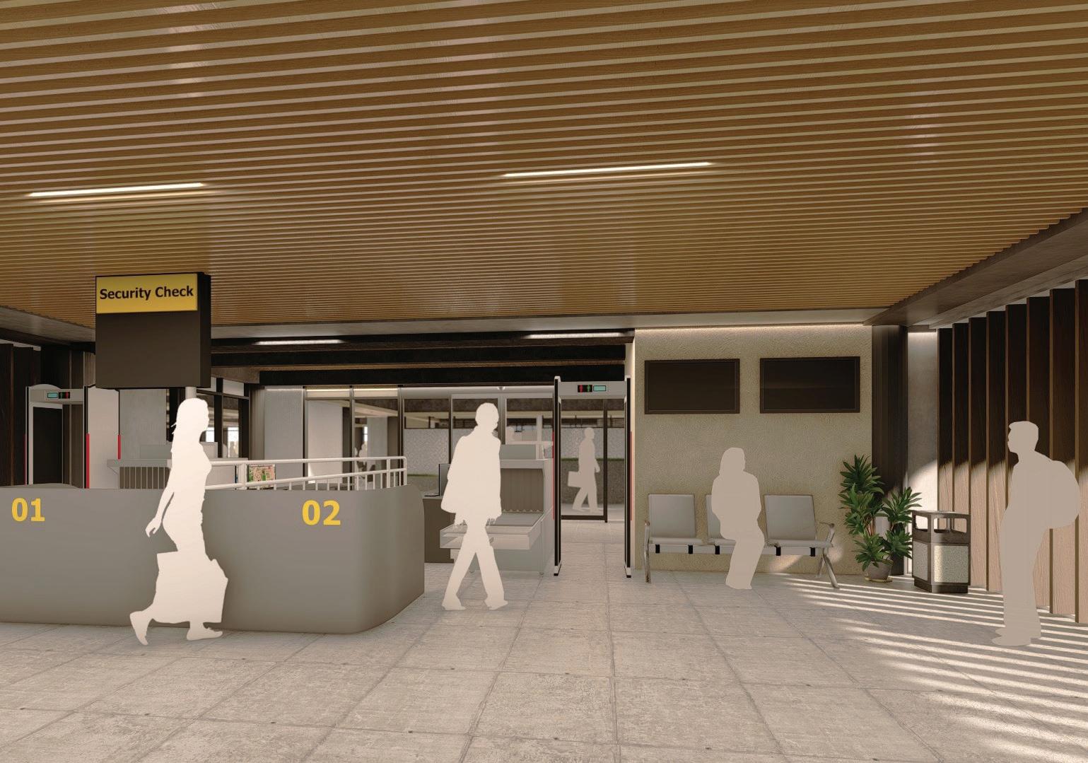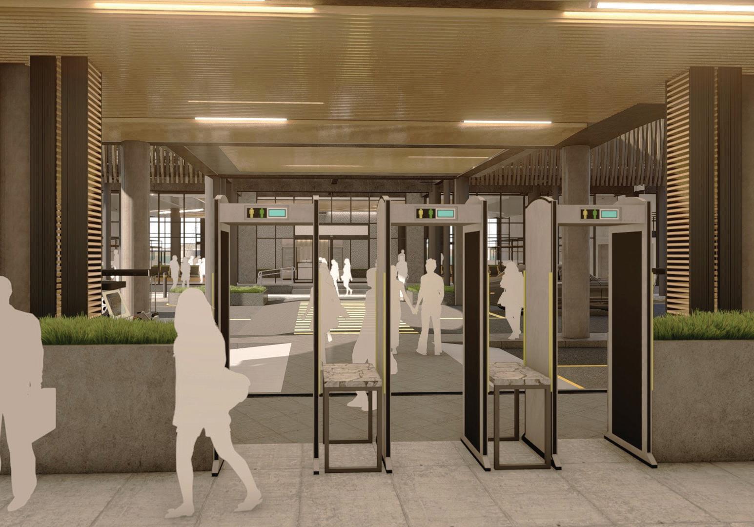 Left Security checkpoints flank the entrances and exits of the landside terminal building.