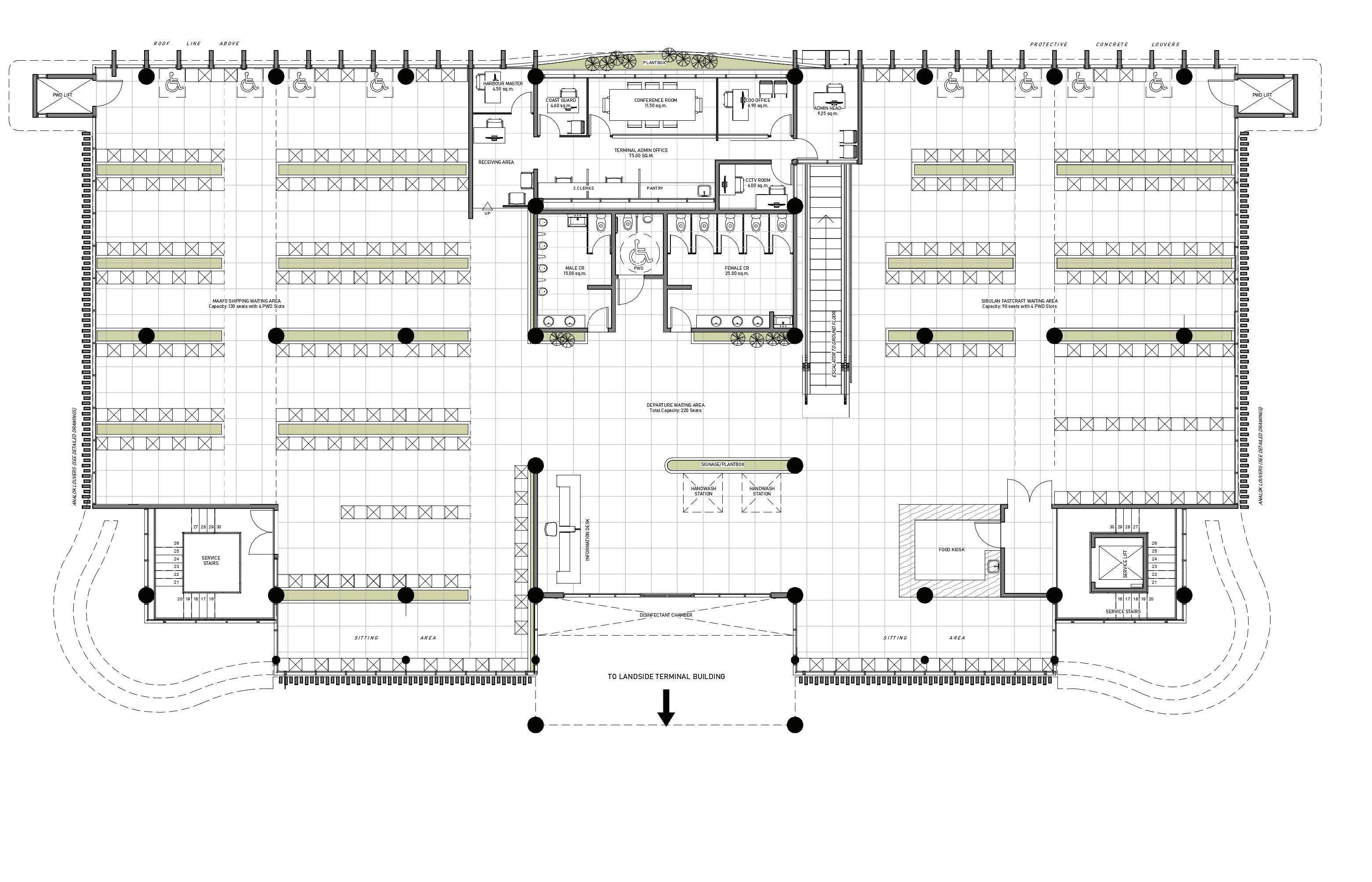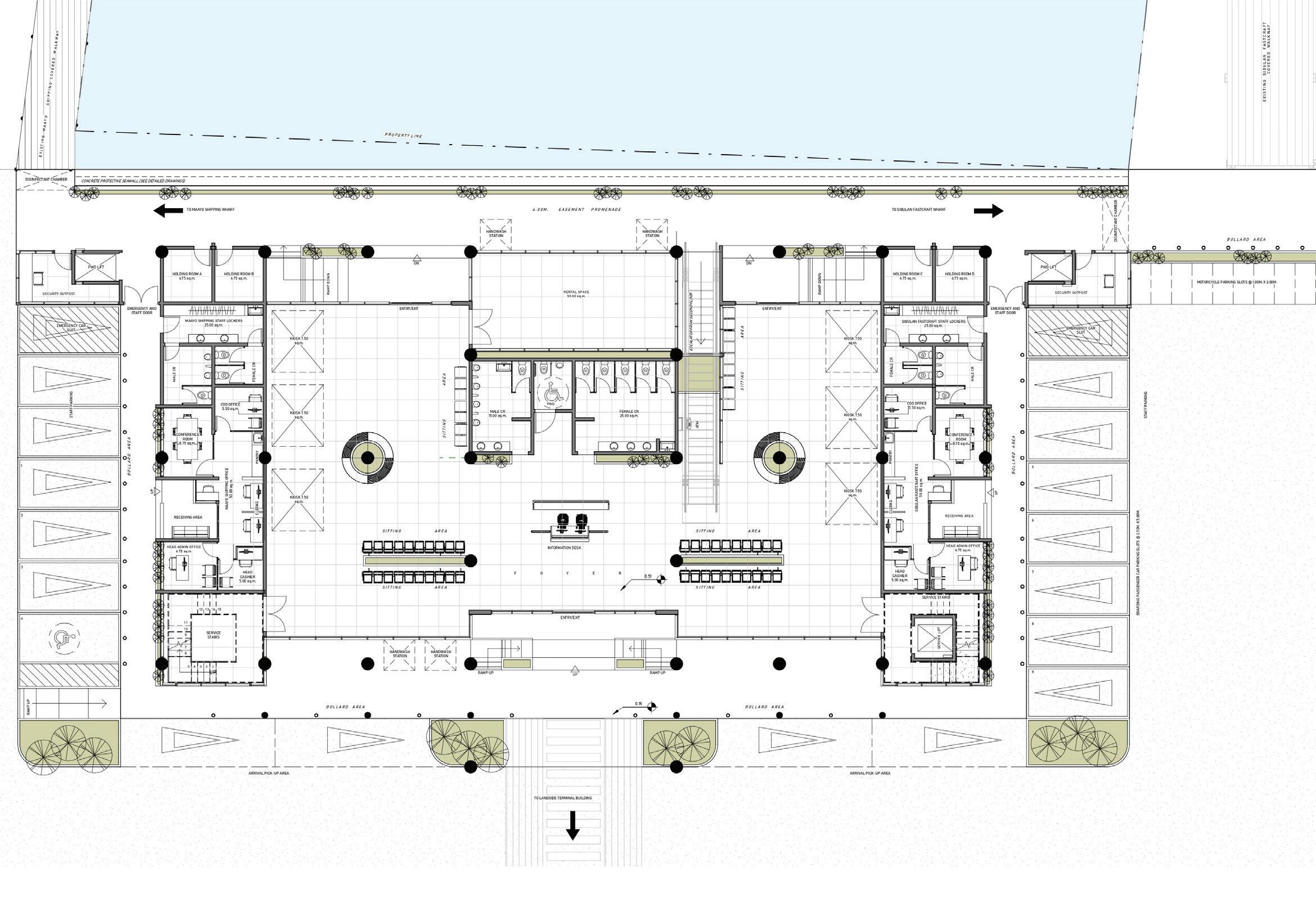 The seaside building, as its name implies, faces the sea and is exclusive for ferry passengers and workers only. The ground floor is allocated for arriving ferry passengers and two offices (Maayo Shipping and Fastcraft). Each passenger is required to pass through this building for added screening and security. Also, laborer locker rooms are provided based on their requests on the surveys done in the study. Two sets of stairs flank on each side of the building, in compliance with the fire code.