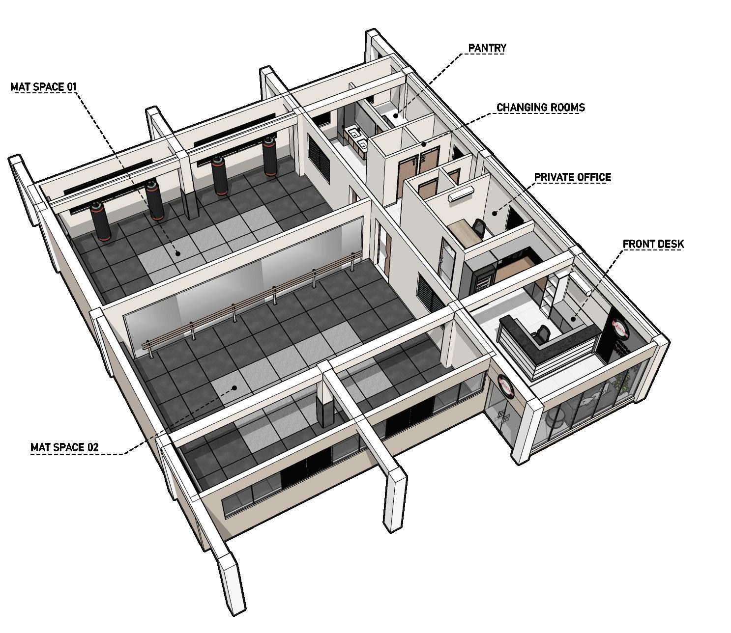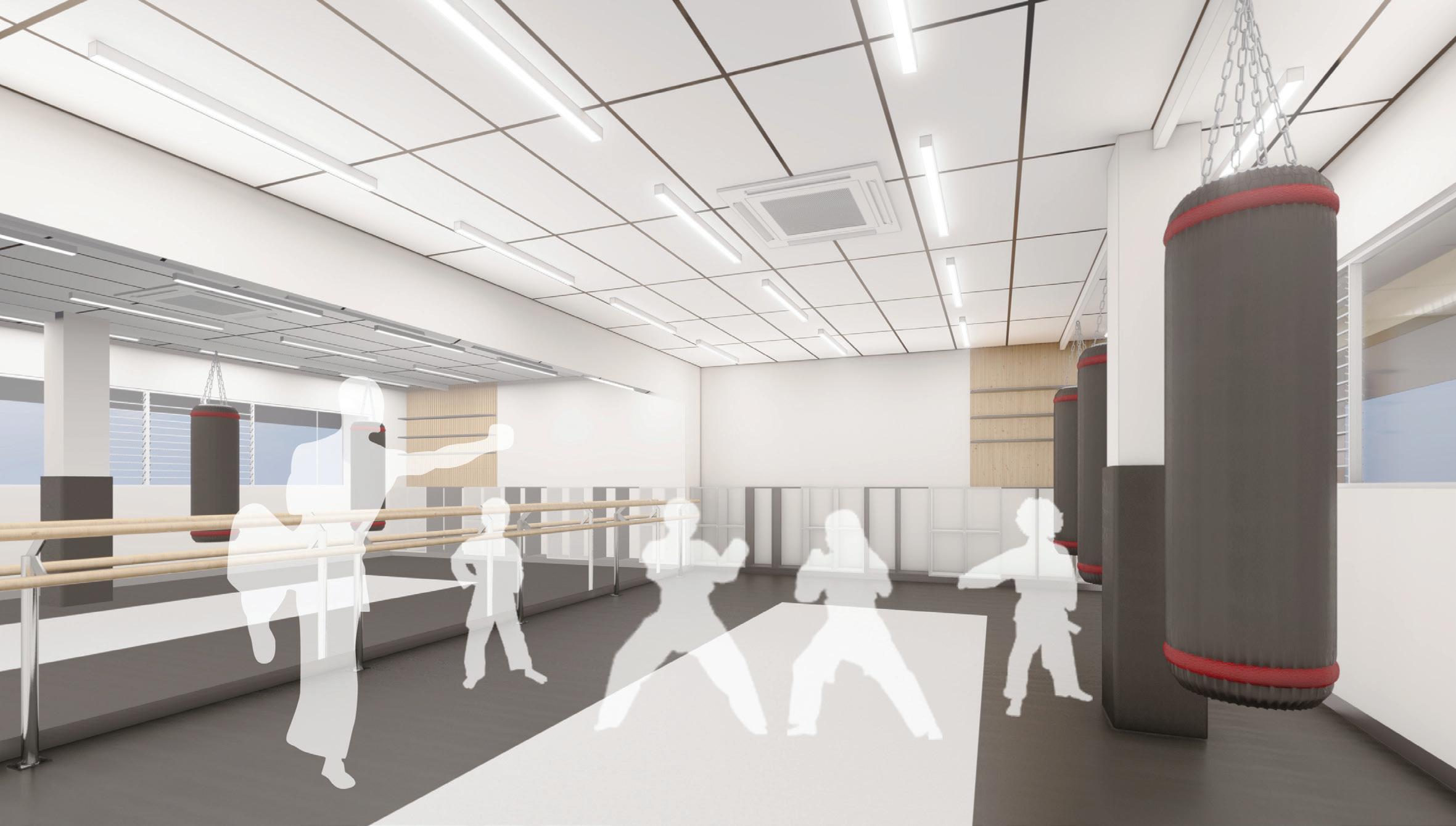 Bottom left Mat Space 2 is decked with a full length mirror, punching bags, and modular shelves.