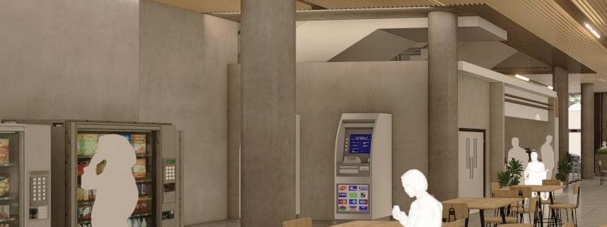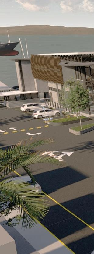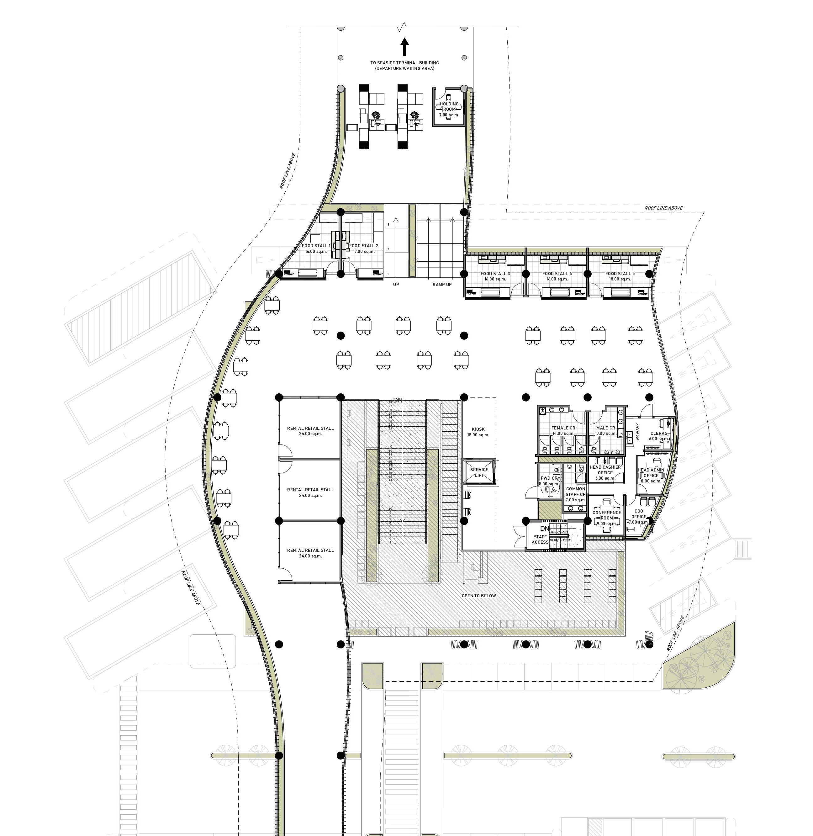 The second floor is allocated for departing ferry passengers and the terminal admin office overlooking the wharf area and coastline. The plan is mostly open which allows room for configuration, especially during a pandemic.