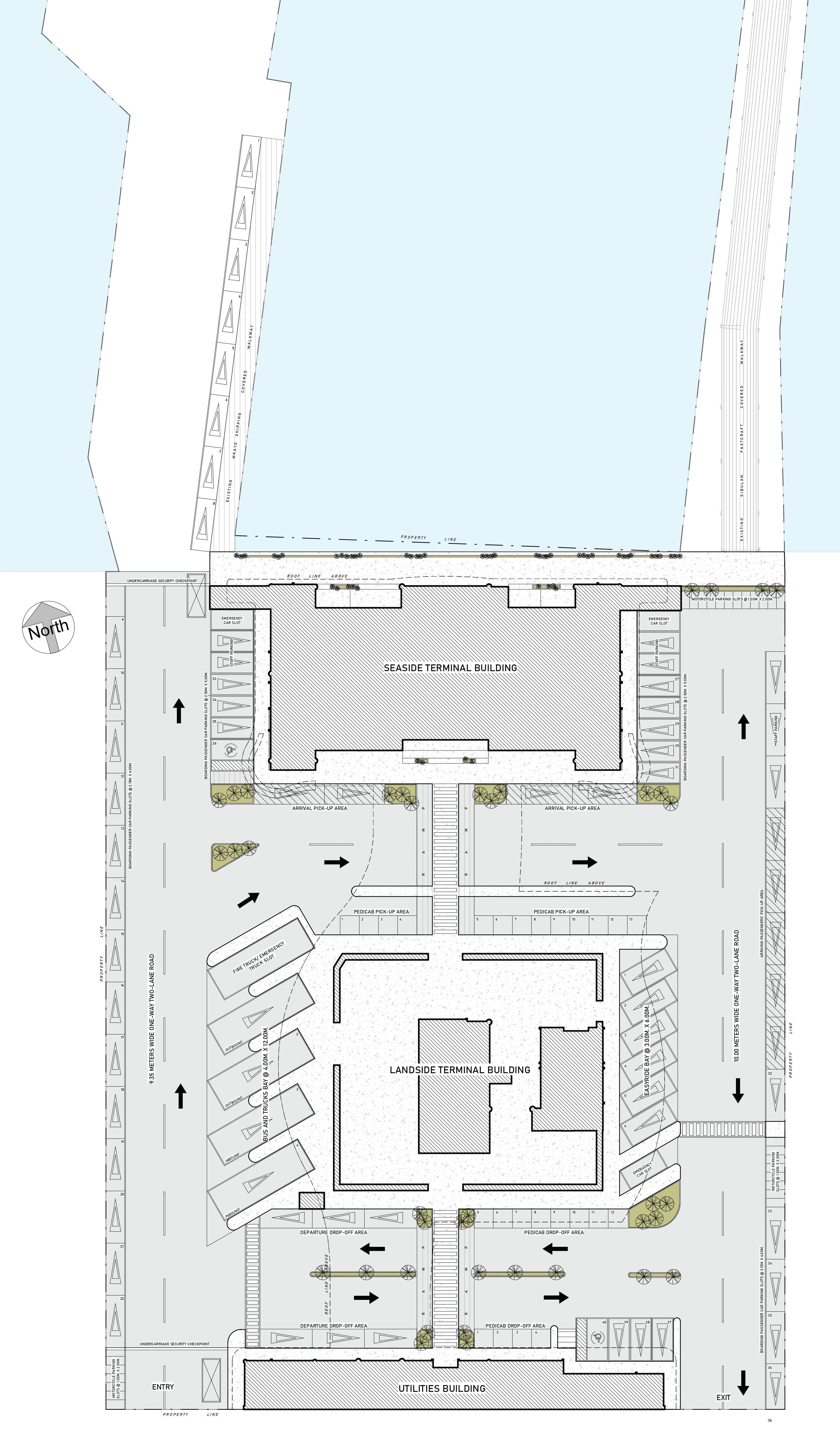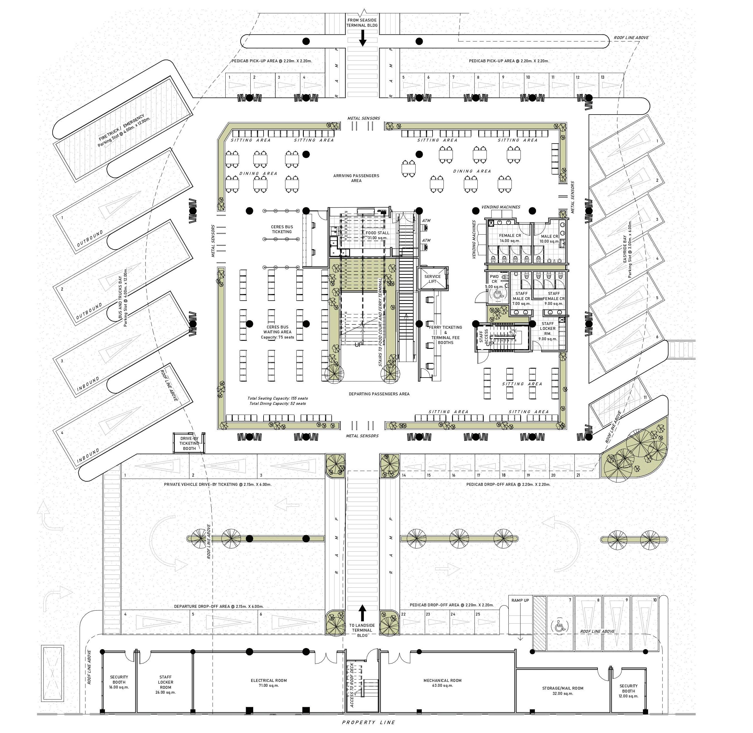 Mobility There are four modes of transportation that are catered in this building: buses, private vehicles, pedicabs and easyrides. Ticketing booths are located at the ground floor while the baggage check is at the second floor prior to entering the seaside building. For improved revenue and profit, rental spaces and a food court are provided at both floors.