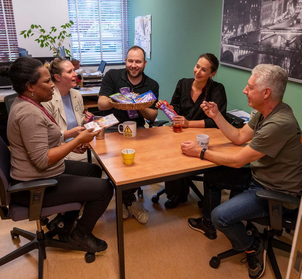 Pauze nemen lukt lang niet altijd. Bij Argos Zorggroep in Spijkenisse bleek chocola de sleutel om alle collega’s een half uur bij elkaar te krijgen. “We praten zo min mogelijk over het werk”, vertelt aios ouderengeneeskunde Mark van Barele.