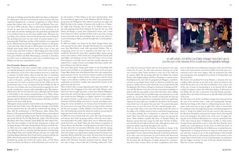 only item of clothing, except that they didn’t wear them on their feet). In collaboration with the local television station, Cadena 100, they organised Imaginarock, a national competition in which Ibizan groups like Statuas (who won it in 1995) and Belcebú Toys, runners-up in 1998, took part. Then at island level, Sargantana Rock became an open door to the promotion of new musicians, in an event with several dates building up to the great final, normally held at Las Dalias because it was the most suitable venue. The prize was recording a disc, a dream come true for groups who were starting off. The growing local scene was also a hive of activity, thanks to programming like Nadal Jove, another of the initiatives once supported by the Administration, but that disappeared without an alternative a few years later when the tap of official grants was turned off. Although many bands didn’t survive more than a year or two, and in fact today only Peter Colours is still working, from that hotbed of groups has arisen an endless list of long-lived musicians: David Serra, Joan Barbel and Kiko Barrenengoa, currently in Fameliars but with a host of collaborations under way in mainland Spain and Mallorca in the most experimental scenario. Paco Fernández, flamenco and dance Paco Fernández, at the time crowned with a bushy head of hair, was already playing his special music in Sant Carles at the turn of the millennium, on his way to that evolution that was to make him a musician of world stature, when he had the idea of combining the guitar with ‘down tempo’, before it occurred to anyone to put a name to the genre - perhaps you’ll recognise ‘flamenco chill’. But his name was not alone on posters from the late 1990s on for his performances here: it was accompanied by José Padilla, his ally of the time at Las Dalias, who won international recognition for writing the soundtrack to sunsets, with multimillion sales. The relationship between the two has lasted for years, although only Fernández is still faithful to his summer programming in Las Dalias, always surrounded by musicians of exceptional stature to support his guitar playing, with Eva Redondo, Dr. Gwon, Juanma Redondo and Elvis Ferrera as his most stable group. Although its terrain seemed to tend towards rock, everything has been heard in the Sant Carles venue. The flamenco heritage of Las Dalias has been present from the start and has evolved with the passage of time, with the performances of Sal Flamenco, Alma Gitana, Paco Romero, Calima, guitarist Marcial and Funkalé, whose sound explored fusion in a natural and relaxed mood. And not just flamenco, jazz is also heard, with the No Tan Big Band, the origin of the Eivissa Jazz Big Band, with Óscar Giménez, Santi Bofill and other island musicians who were members of one the first wind groups on Ibiza, and including the Jazz Club with Gresely, Dennis Herman and Edu García. There was even a night when the resident rockers set out to play soul. And they took it so seriously that Dan Jiménez, Gresely, Jorge Ortiz, Miguel Fears and Cristóbal Mascaró all came out to play with matching elegant dark suits. Even ‘house’ had its moment, well into the 2000s, with several sessions by dj Soldado and David Moreno. Similarly, the garden has hosted the eastern dance of Nur Banu, Zorah and Zinue, the flamenco of Eva Redondo, and even the tan·