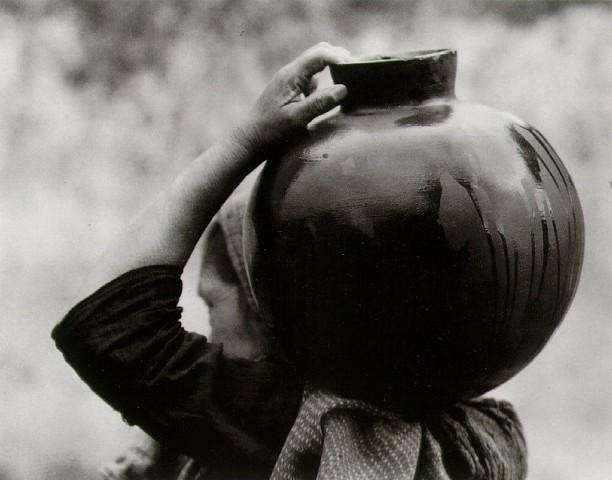 In questa fotografia possiamo apprezzare la mano e il braccio che contrastano con il grande vaso d'acqua portato a spalla da una donna.