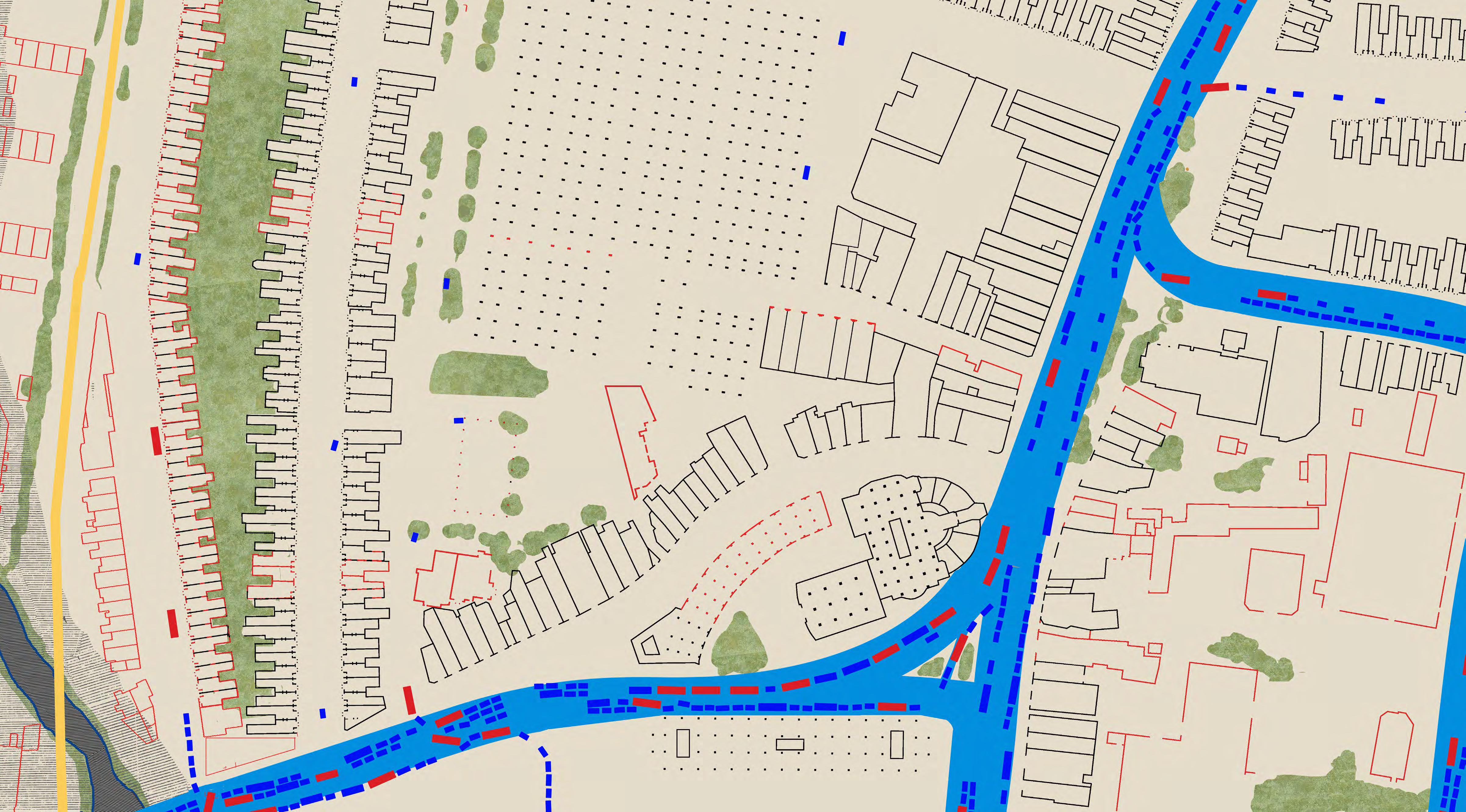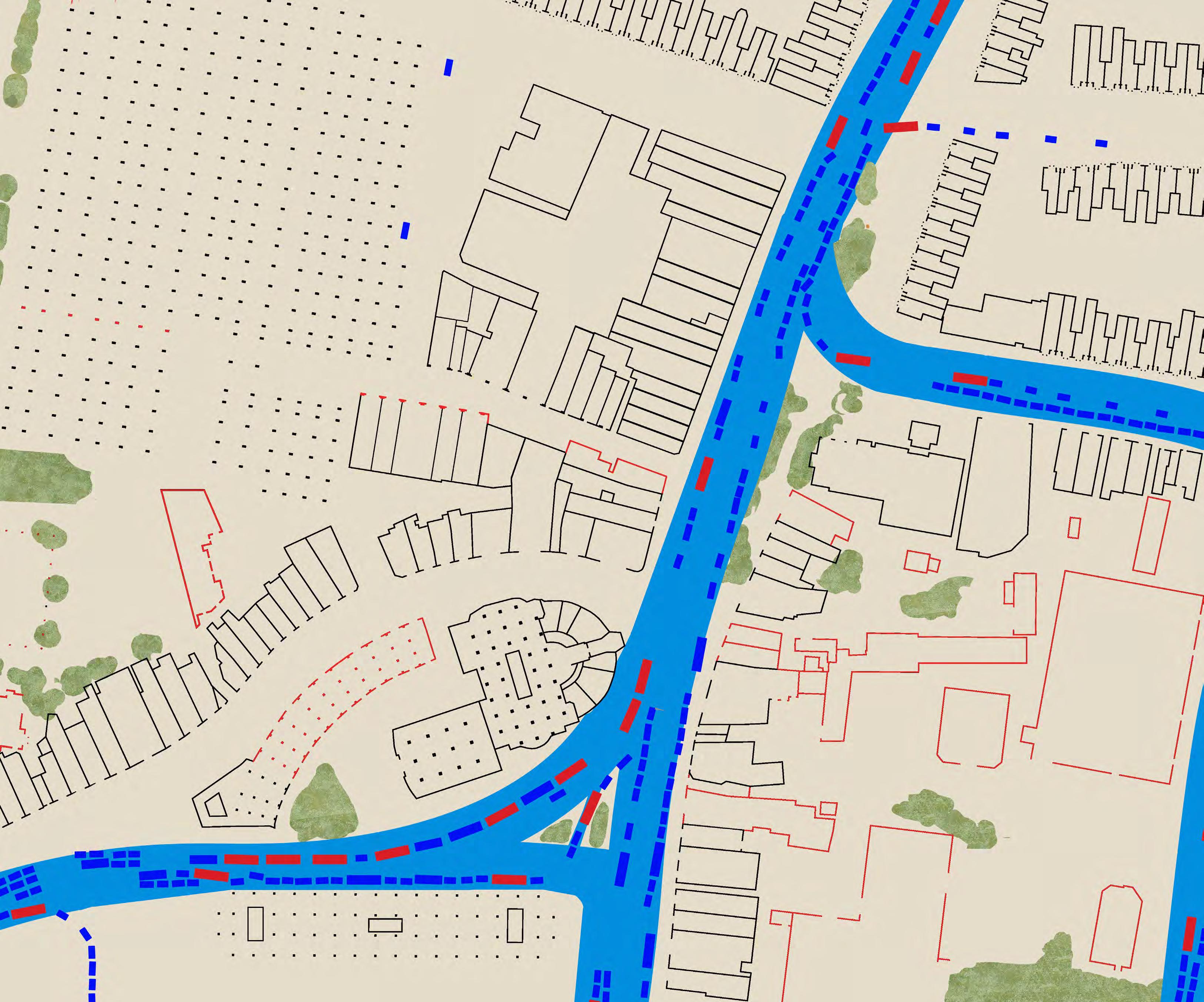 TRAIN BIKE BUS PEDESTRIAN ROUTES MAIN ROADS SCHOOL + CARE + WELFARE LOCAL VENDORS + REPAIR ARCADE RECREATION + ENTERTAINMENT LOCAL GROWIING + HYDROPONICS HEALTH + FITNESS + WELLBEING COMMUNAL AREAS + HOUSING EXTENSIONS GREEN CORRIDOR + BIODIVERSITY RIVER + NEW CANALS South Circular Road Bus + Hire Car Only South Circular Road Bus + Hire Car Only Lewisham High St Bus+ Hire Car Only Viewfinder Next Page