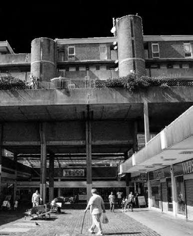 Existing Milford Towers short section consisting of four rows of one bed residential apartment blocks above a multi-storey carpark and shopping precinct.