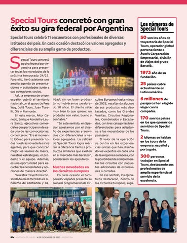 pecial Tours concretó su gira federal por Argentina para presentar todas las novedades de la próxima temporada 24/25. Para ello, llevó adelante una amplia agenda de presentaciones y actividades junto a sus operadores socios. Así, la empresa de origen español cubrió el territorio nacional con el apoyo de Free Way, Juliá Tours, Juan Toselli, Ola y Piamonte. En este marco, Aitor Canedo, Enrique Rondelli y Laura Santo, ejecutivos comerciales que participaron de cada una de las convocatorias, comentaron: “Era el momento idóneo para presentar todas nuestras novedades a los agentes, para que conozcan mejor los valores de marca, nuestras estrategias, el producto y el equipo. Además, es una oportunidad para escuchar las necesidades y opiniones de manera directa”. “Nuestra trayectoria consolidada en el mercado es sinónimo de confianza y ca-