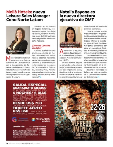 QUINCENARIO PARA PROFESIONALES DE TURISMO 3 DE JULIO DE 2023 - AÑO XXI - ED. Nº 369 CO LO MBIA Royal Caribbean: atractivas escapadas del Utopia of the Seas 46 Natalia Bayona es la nueva directora ejecutiva de OMT 18 INCLUSIVE COLLECTION. Así es el Dreams Flora en Punta Cana 28 VIAJES CIRCULAR. 29 años de solidez y experiencia 26 ENTREVISTA ARTURO BRAVO Viceministerio de Turismo responde a la inconformidad de los gremios del turismo 12