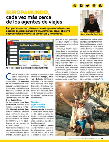 on la activa participación en relevantes ferias turísticas de distintos países, Europamundo ha comenzado con fuerza sus presentaciones de productos y de novedades para este año, teniendo ya una agenda completa de encuentros presenciales y virtuales –para marzo y abril–en Centro y Sudamérica. De esta manera, Luis García Codrón, fundador y director general de la compañía; Alejandro de la Osa, director comercial; y todo el equipo comercial están cada vez más cerca de volver a encontrarse con los clientes tradicionales y todos aquellos que se han sumado en el último tiempo. “Son los minoristas que han estado en cada una de nuestras capacitaciones, escuchando a nuestros guías en