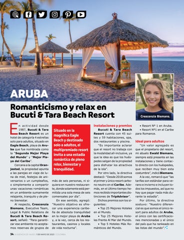 QUINCENARIO PARA PROFESIONALES DE TURISMO 1 DE MAYO DE 2023 - AÑO XXI - ED. Nº 365 CO LO MBIA Integración Avianca-Viva Air en stand-by 8 DATE. Referencia de negocios y networking en el Caribe 46 ASSIST-MED. Nuevo nombre para la compañía: Safe Travel Assistance 6 ARUBA. Romanticismo y relax en Bucuti & Tara Beach Resort 34 EUROPAMUNDO. 170 programas para disfrutar de Suiza 42 DISNEY 100 años cargados de novedades 10 DISTORSIÓN: GOBIERNO Y TURISMO