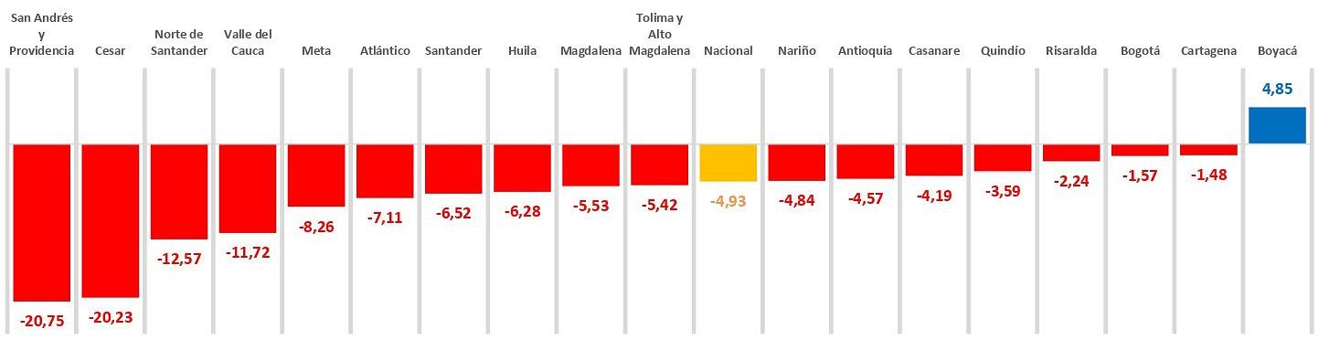 comportamiento negativo: Cartagena, Caribe, Eje Cafetero, Antioquia, San Andrés y Providencia, Pacífico, Santanderes, el Golfo de Morrosquillo y Sabana.