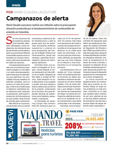 ría de los países, tiene una comisión de regulación para definir las reglas de los mercados de energía (Comisión de Regulación de Energía y Gas-CREG) que define las reglas del juego para asegurar la disponibilidad de una oferta energética eficiente, propiciar la competencia en el sector de minas y energía, y proponer la adopción de las medidas necesarias para impedir abusos de posición dominante y buscar la liberación gradual de los mercados hacia la libre competencia. La crítica situación de abastecimiento de combustible para aviación en Colombia refleja sin duda varios problemas en este proceso. Colombia es un país que necesita estar conectado por aire, además de ser un servicio público esencial. Se prendieron las alarmas y aunque bajen las aguas debemos estar preparados.•