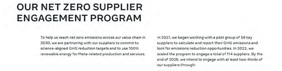Development of a program to engage directly with the company’s suppliers to reduce Scope 3 emissions from products, materials, and services purchased by Meta.
